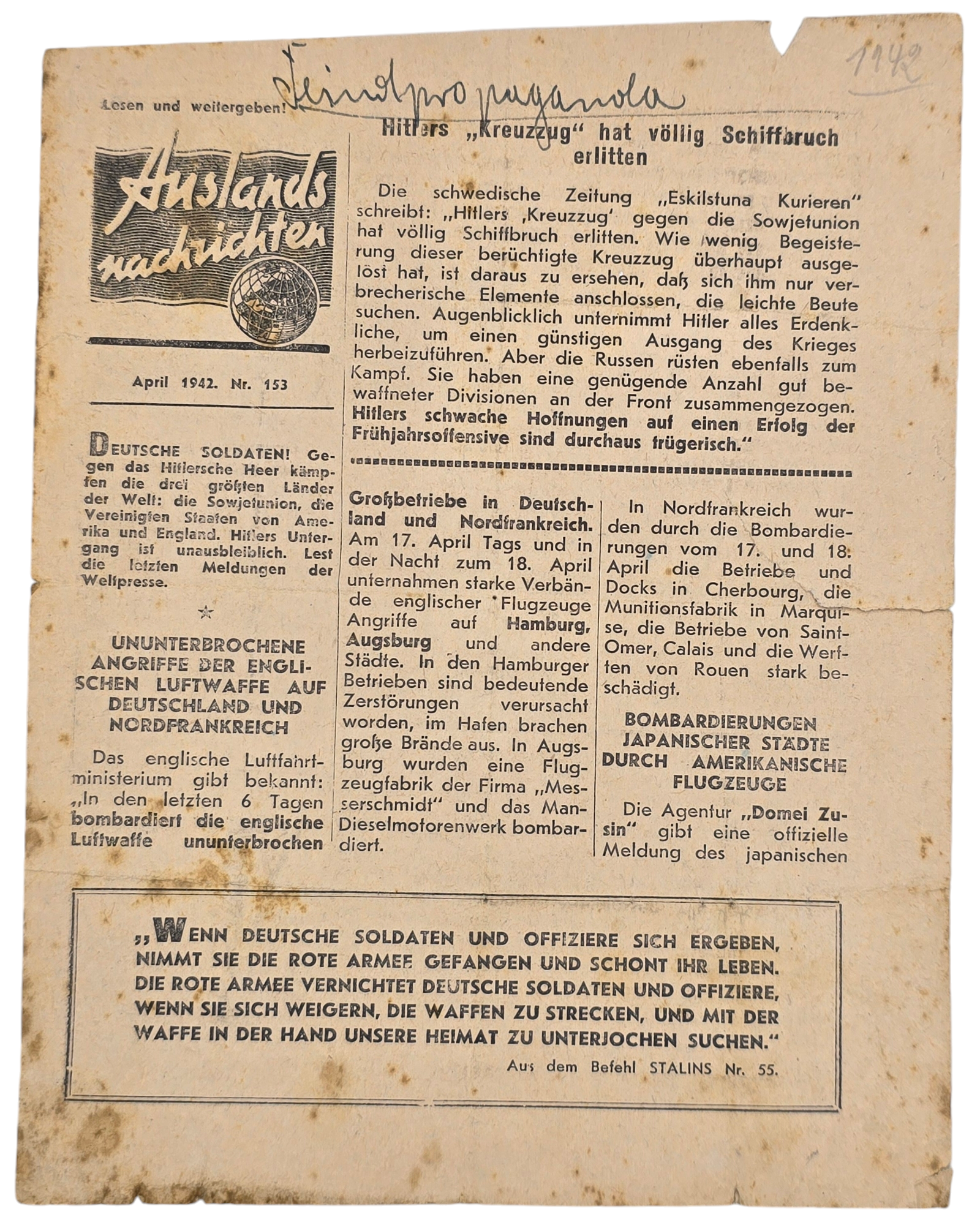Original WW2 Russian Leaflet - 1244 "Auslands Nachrichten Nr. 153" (1942)