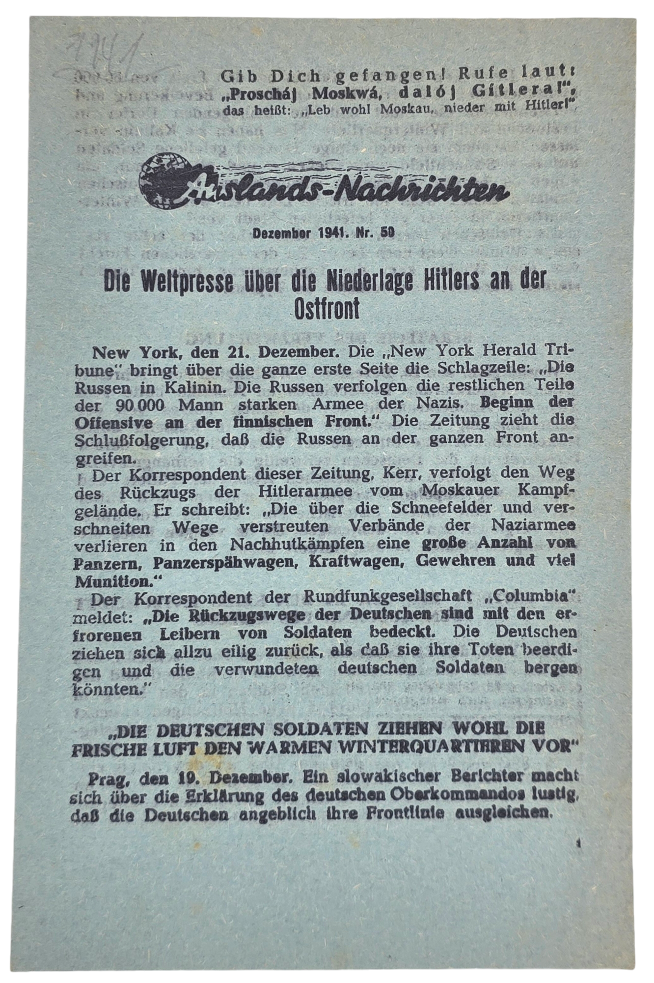 Original WW2 Russian Leaflet - 601 "Auslands Nachrichten Nr. 50'' (1941)