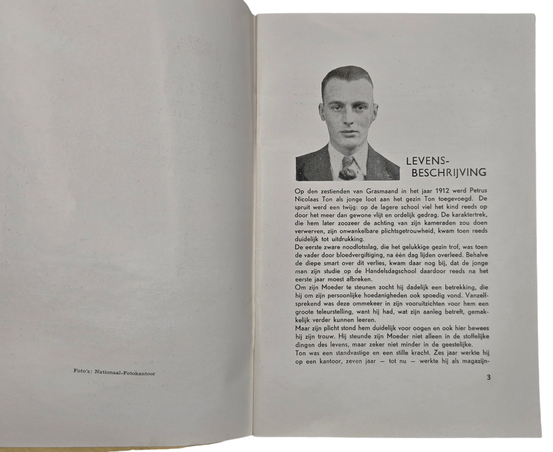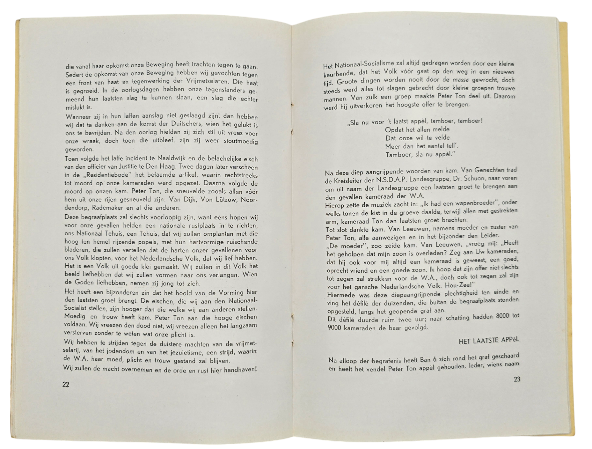 In 1940 the WA man Peter Ton got killed during a parade in The Hague. The NSB held a large funeral for him and this brochure remembers him. With preface by Arie Zondervan.