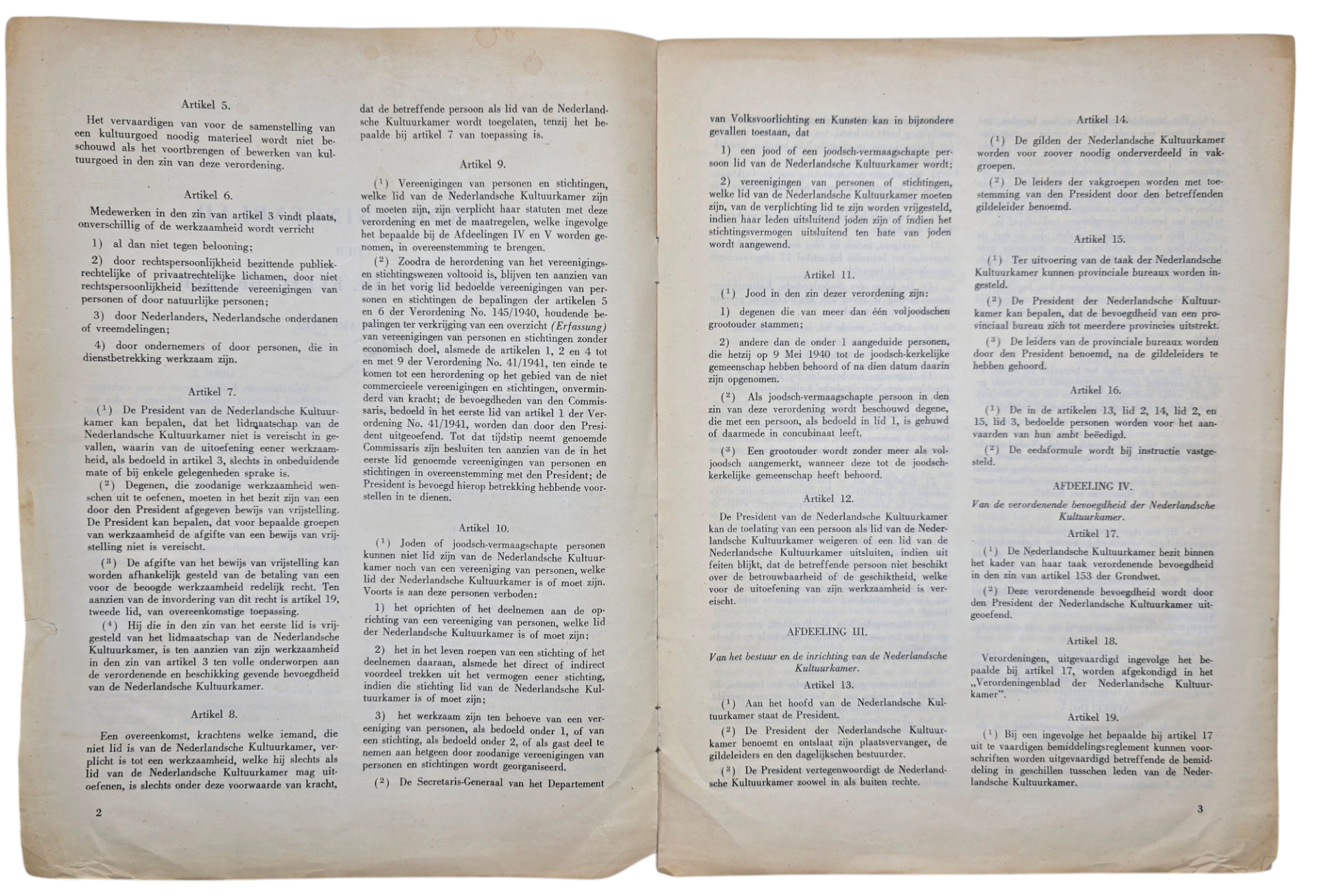 Original WW2 Dutch Collaboration Document - Verordeningenblad Nederlandsche Kultuurkamer No. 1, ''No jews allowed'' (1942)