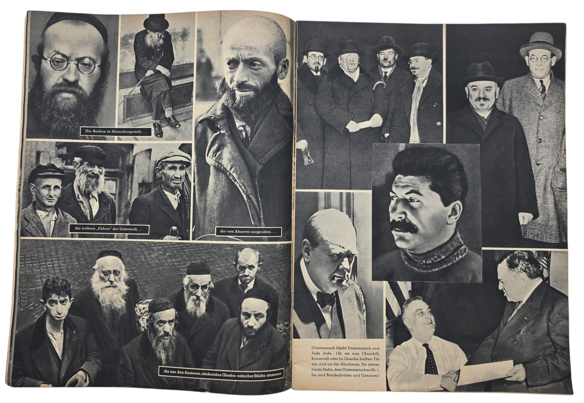 Well-known Anti-semitic and Anti-Eastern European Brochure ''Der Untermensch''. The brochure compares the Nazi ''Ubermensch'' and the (according to the Nazis) ''Untermensch'' in a horrible way. This brochure has been published in many languages. Made by the SS-Hauptamt and published and printed by Nordland Verlag Berlin. Small damage on the cover and the spine. One page has been repaired with acid-free tape.