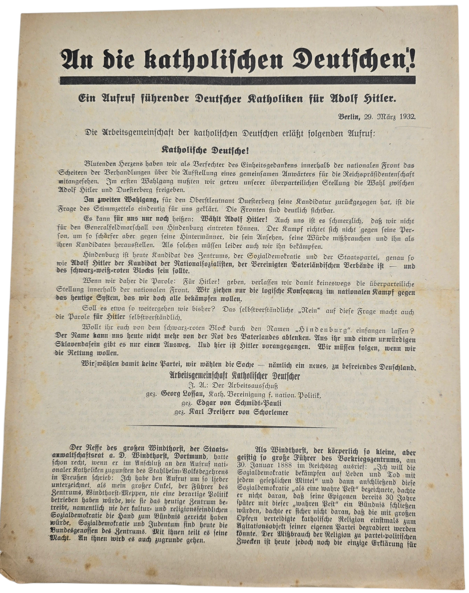 Original WW2 German NSDAP Document - Election Flyer ''An die Katholischen Deutschen!'' (1932)
