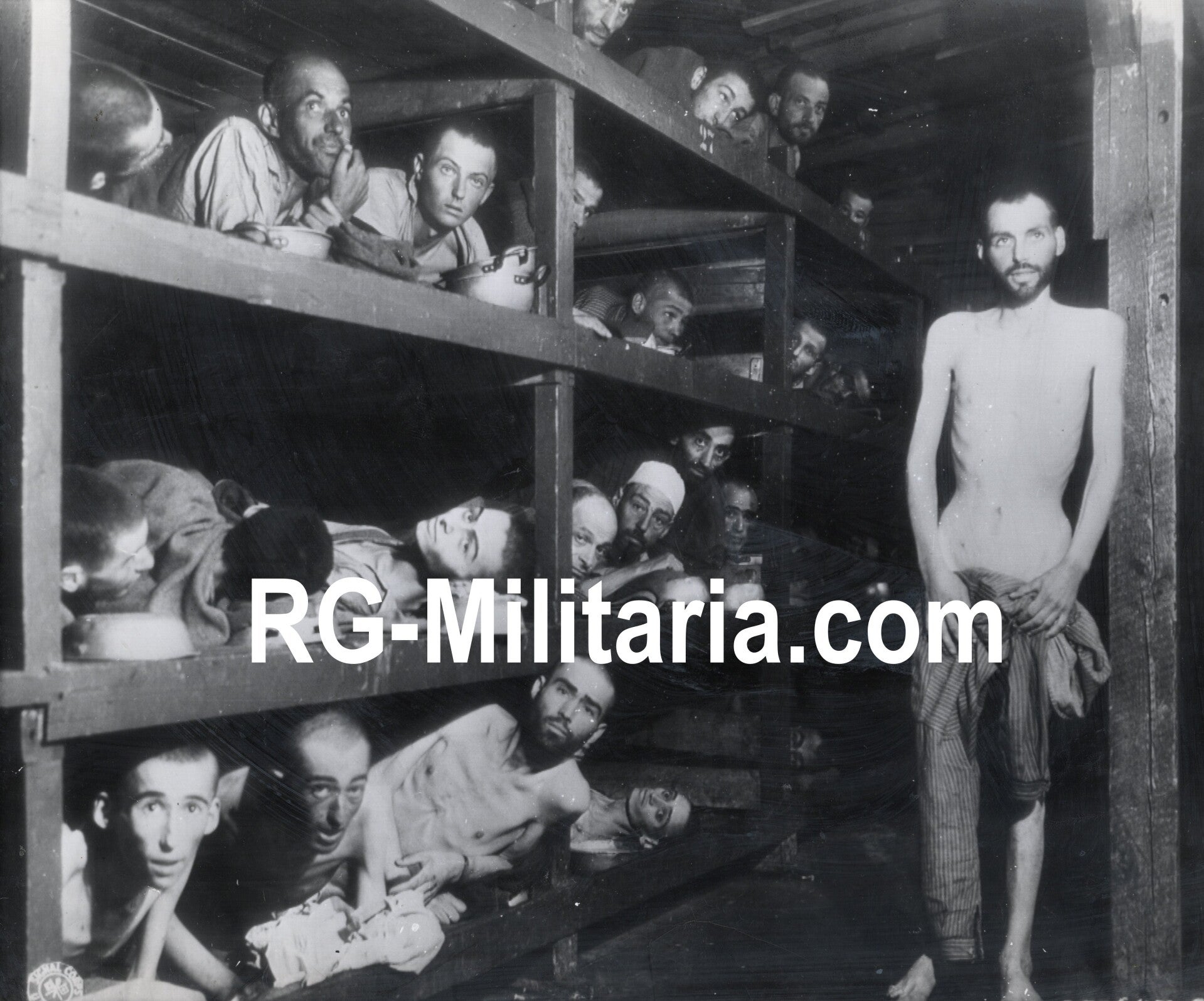 Originele Wo2 Amerikaanse Persfoto - KZ lager Buchenwald concentratiekamp gevangenen bevrijd (1945)