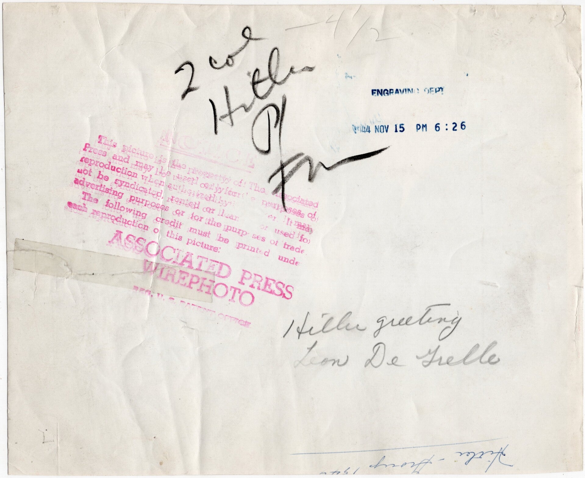 Originele Wo2 Amerikaanse Persfoto - Waalse Waffen SS Ridderkruisdrager Leon Degrelle ontvangt een eikenloof van Adolf Hitler, naast hem Felix Steiner (1944)