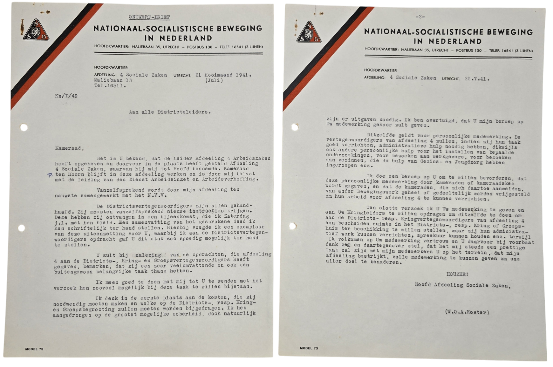 Original WW2 Dutch NSB Collaboration Document - WA Weerafdeeling letter notice to all WA District leaders, W. O. A. Koster, Utrecht (1941)