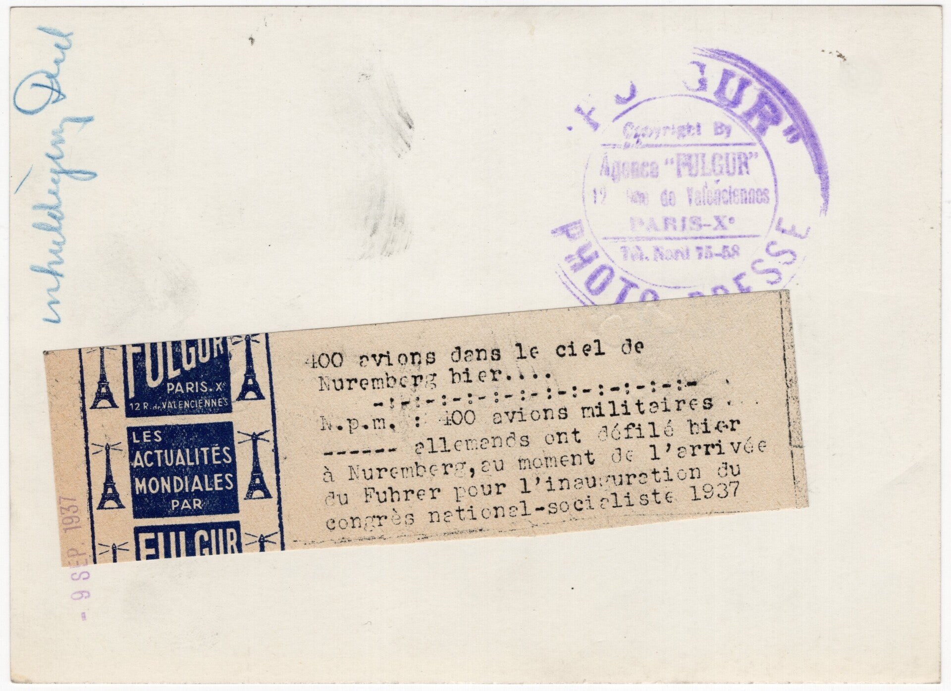 Originele Wo2 Franse Persfoto - Luftwaffe vliegtuigen vliegen over, Reichsparteitag Nürnberg (1937)