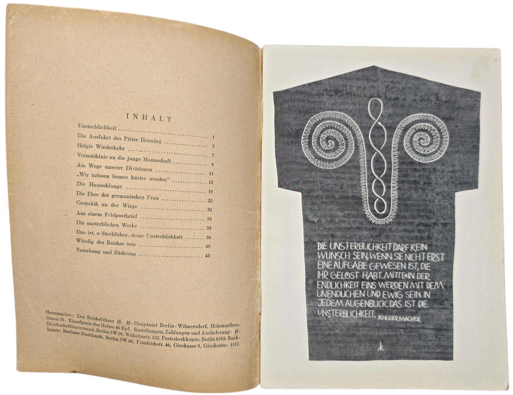 SS-brochure met veel artikelen die laten zien hoe de SS dacht. Inclusief een bijlage over een bevel van SS Reichsfuhrer Heinrich Himmler aan de ''ariërs'' om meer babies te maken voor het Reich. Geschreven door Dr. Hans Sievers. Er zit ook een artikel binnenin over de SS Panzer Grenadier Divisie Totenkopf. Er mist een klein stukje mist op de achterkant (zie laatste foto).