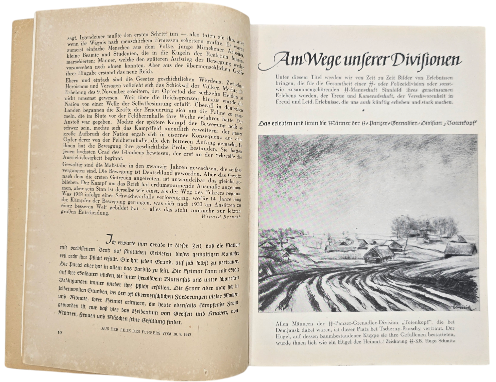 SS brochure with many articles that show how the SS thought. Includes an add-on about an order by SS Reichsfuhrer Heinrich Himmler to make more ''aryan'' babies for the rich. Written by Oberarzt D. R. Dr. Hans Sievers. There is also an article about the SS Panzer Grenadier Division Totenkopf inside. A small piece missing on the backside (see last picture).