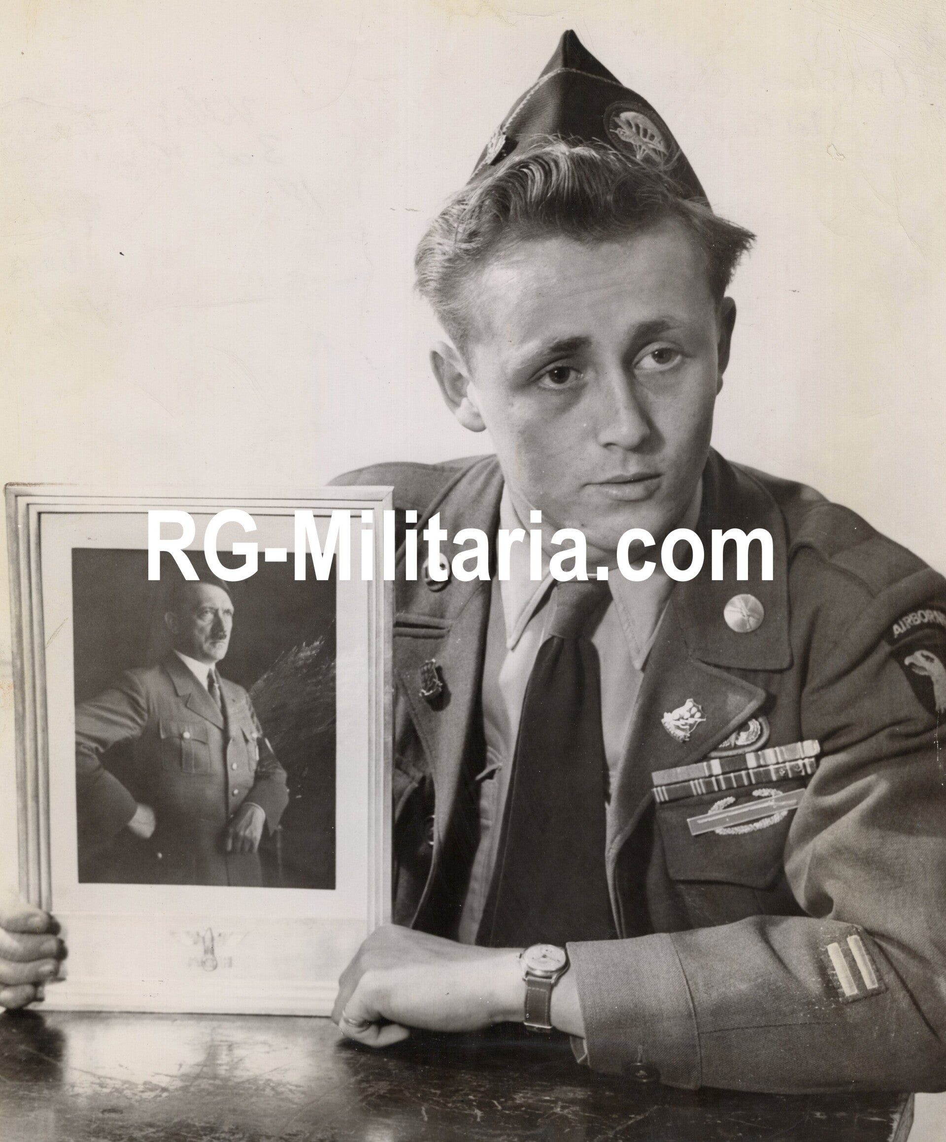 Original WW2 US Press Photo - Pvt. Edward Clark with his war trophy, a personal framed Adolf Hitler portrait (1946)