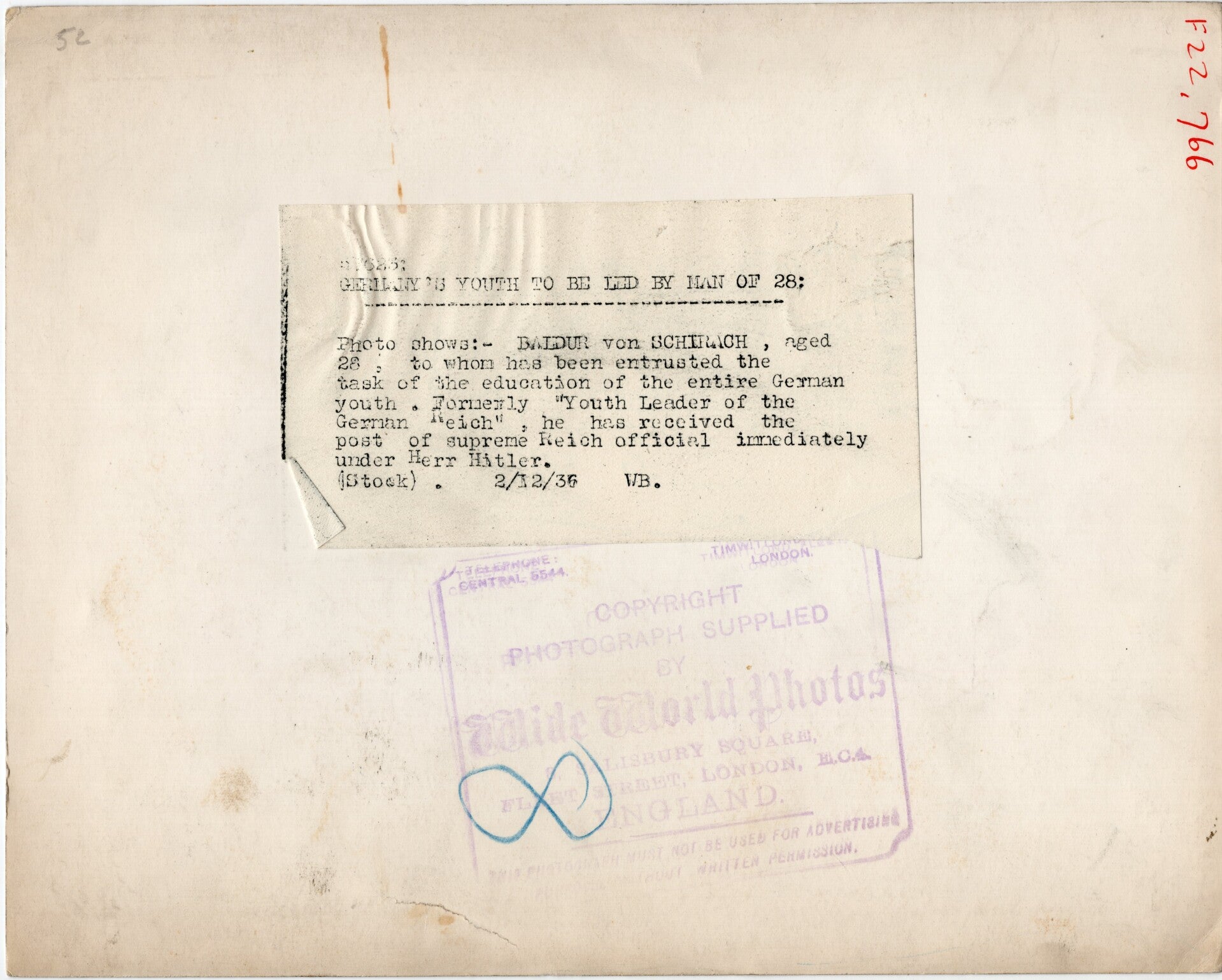 Originele Wo2 Britse Persfoto - HJ Hitlerjugend leader Baldur von Shirach portretfoto (1935)