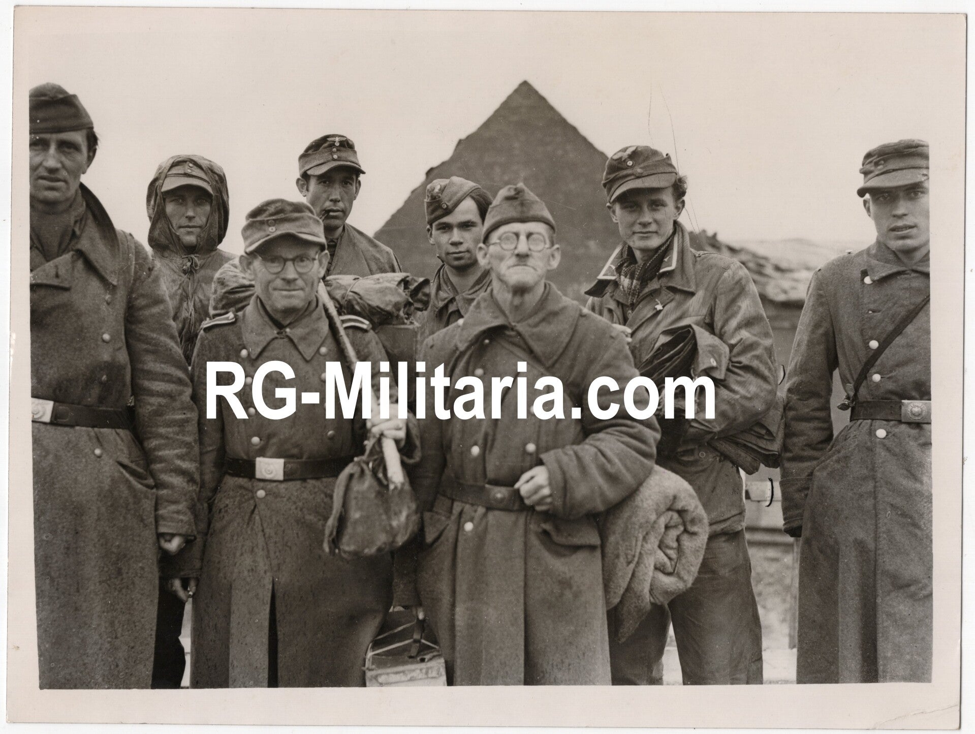 Original WW2 British Press Photo - 9th US Army capture old German POW's Volkssturm men in Tangemunde (1945)