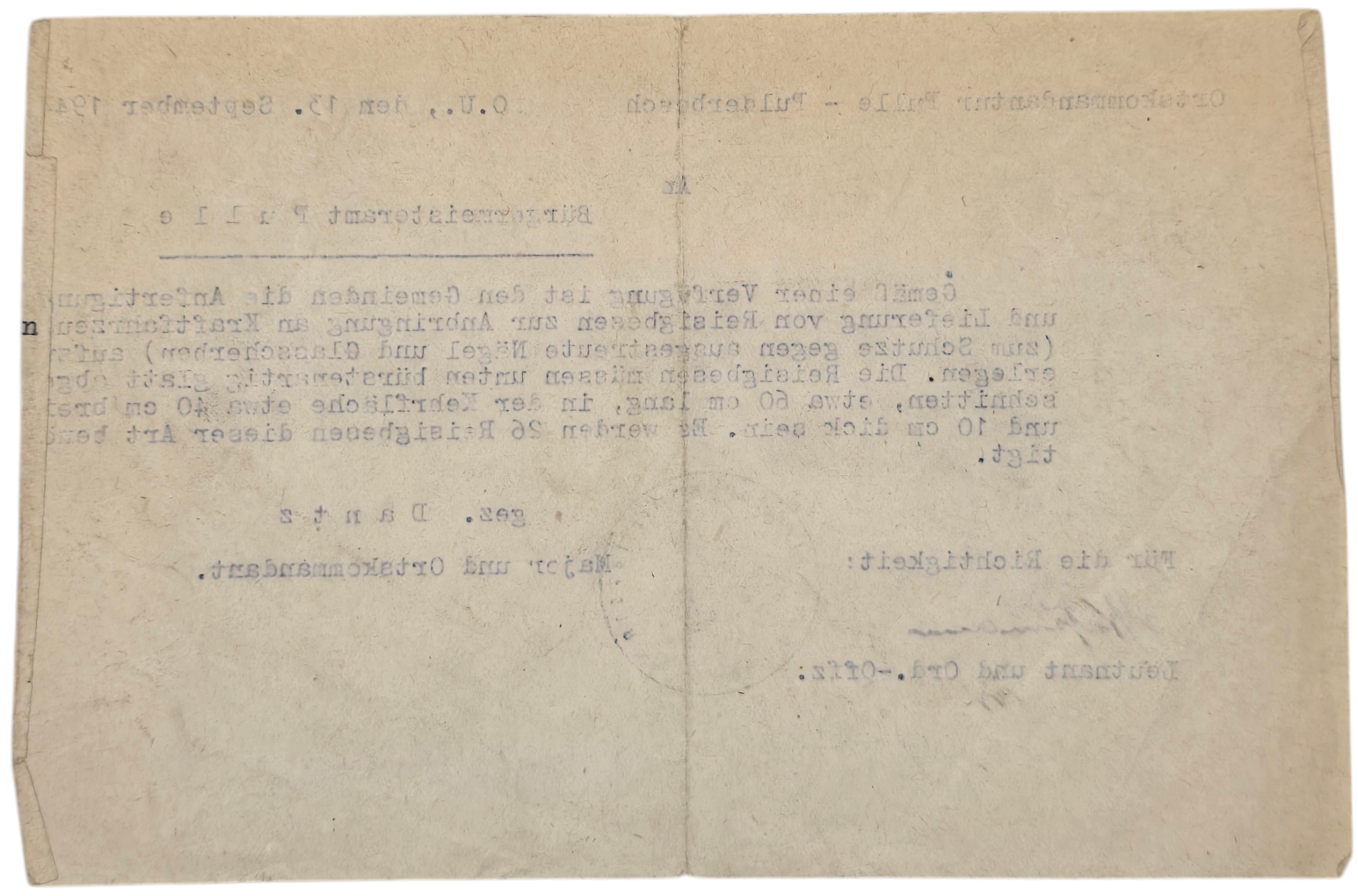 Original WW2 Belgian Document - Ortskommandantur Pulle Pulderbosch, Major Dantz (1944)