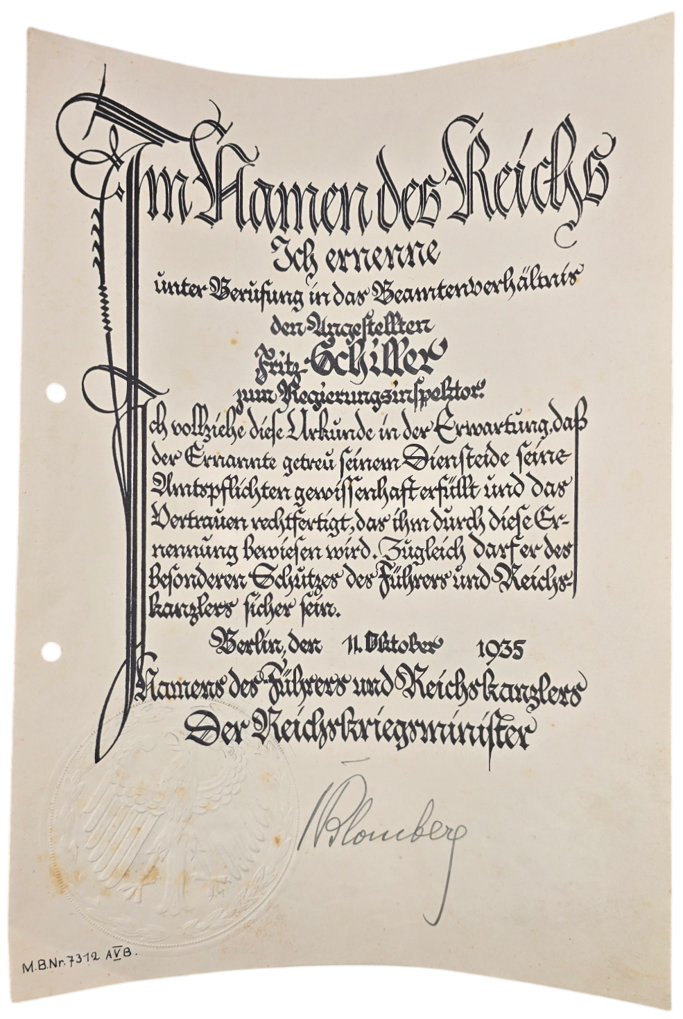 Originele Wo2 Duitse Documenten Set - Wo1 en Wo2 Kriegsmarine set Regierungsinspektor Fritz Schiller, signed by von Blomberg, Wilhelmshaven (1900 1949)