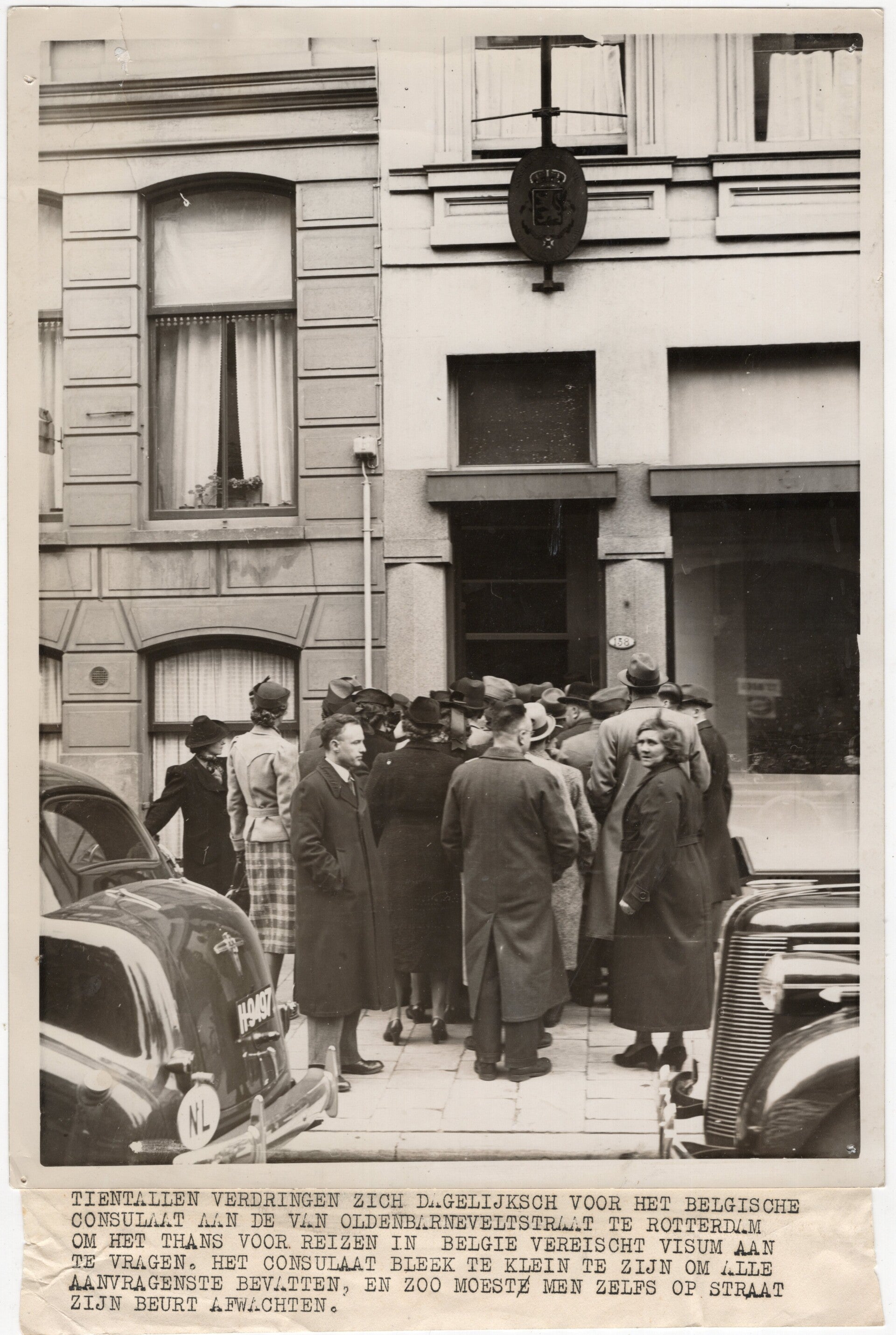Originele Wo2 Nederlandse Persfoto - mensen verzamelen zich voor de Belgische ambassade in Rotterdam om naar België te gaan, mei (1940)