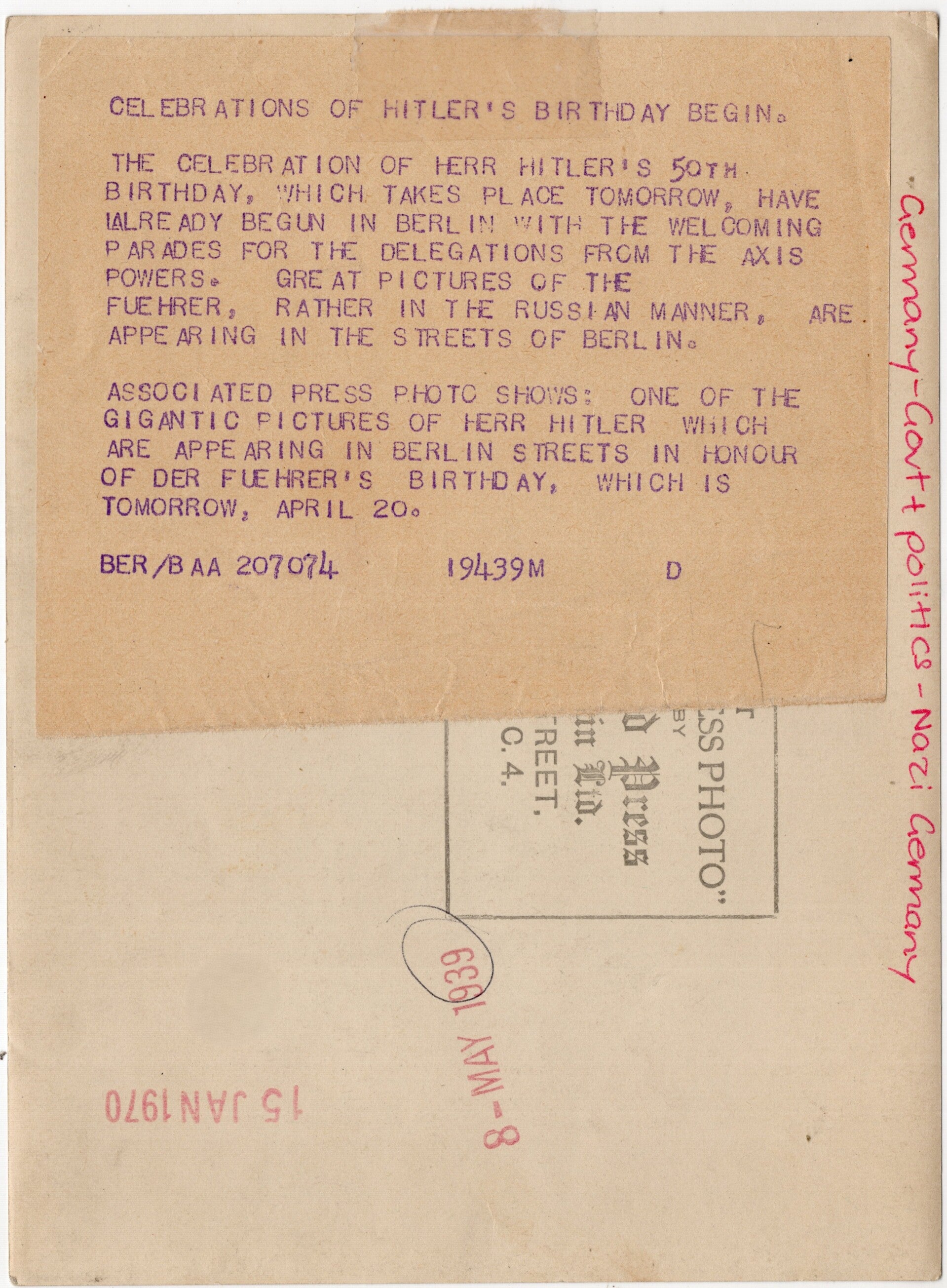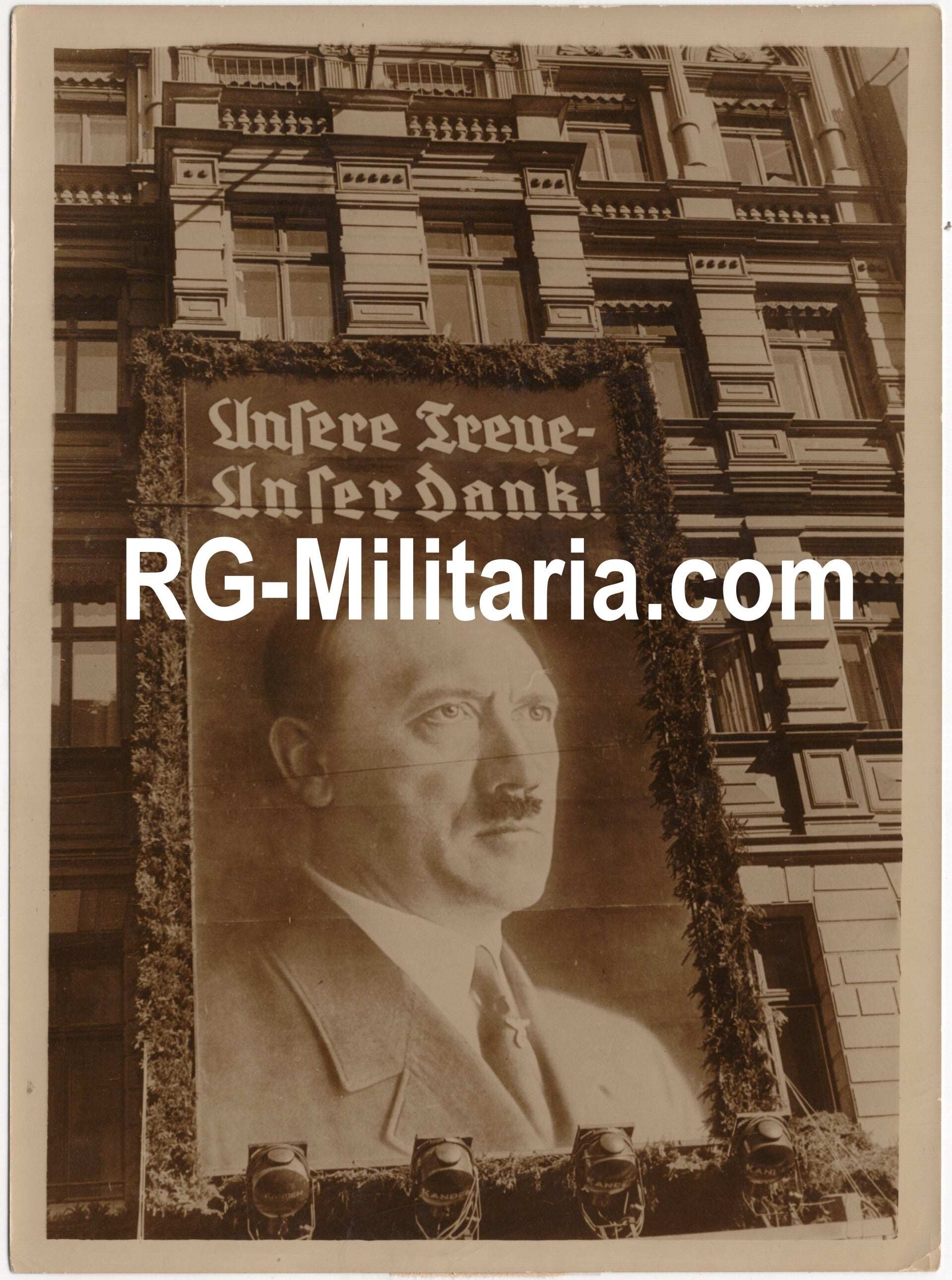 Original WW2 British Press Photo - Adolf Hitler banner for his 50th Birthday, Berlin (1939)