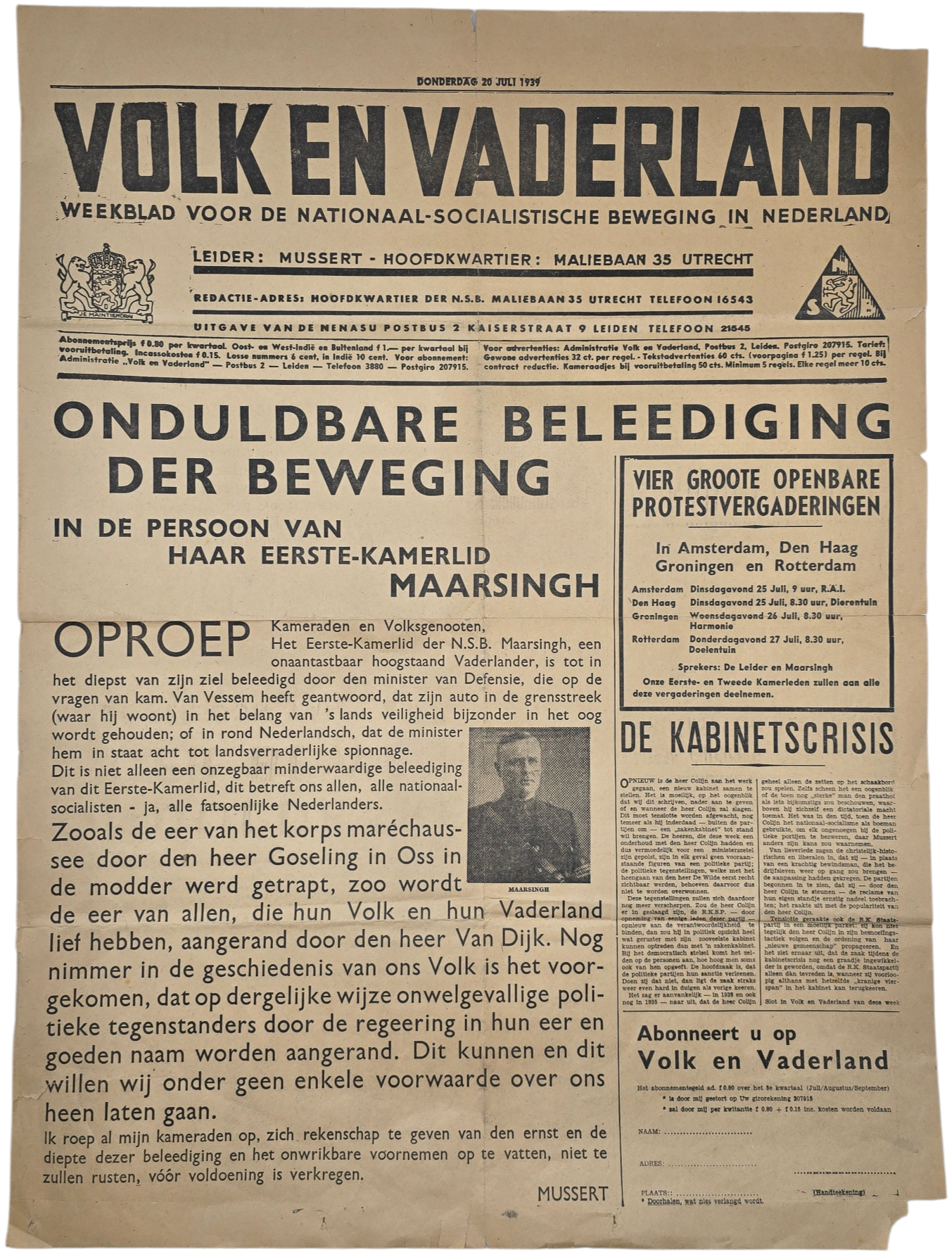 Original WW2 Dutch Collaboration NSB Document - Volk en Vaderland add-on NSB parliament member Jacob Maarsingh (1939)