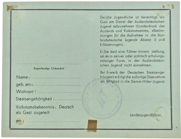Original WW2 Belgian HJ Document - Hitlerjugend Landesjugendführung Belgien Gastausweis (1942)