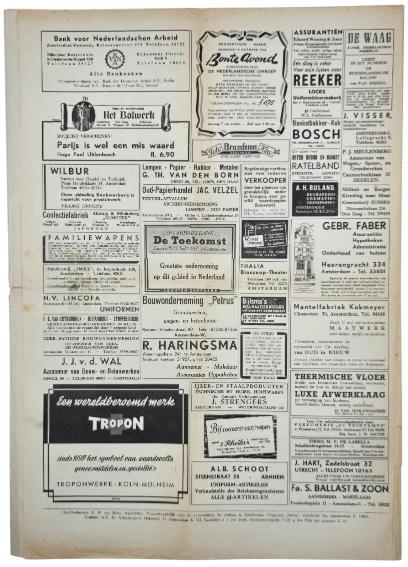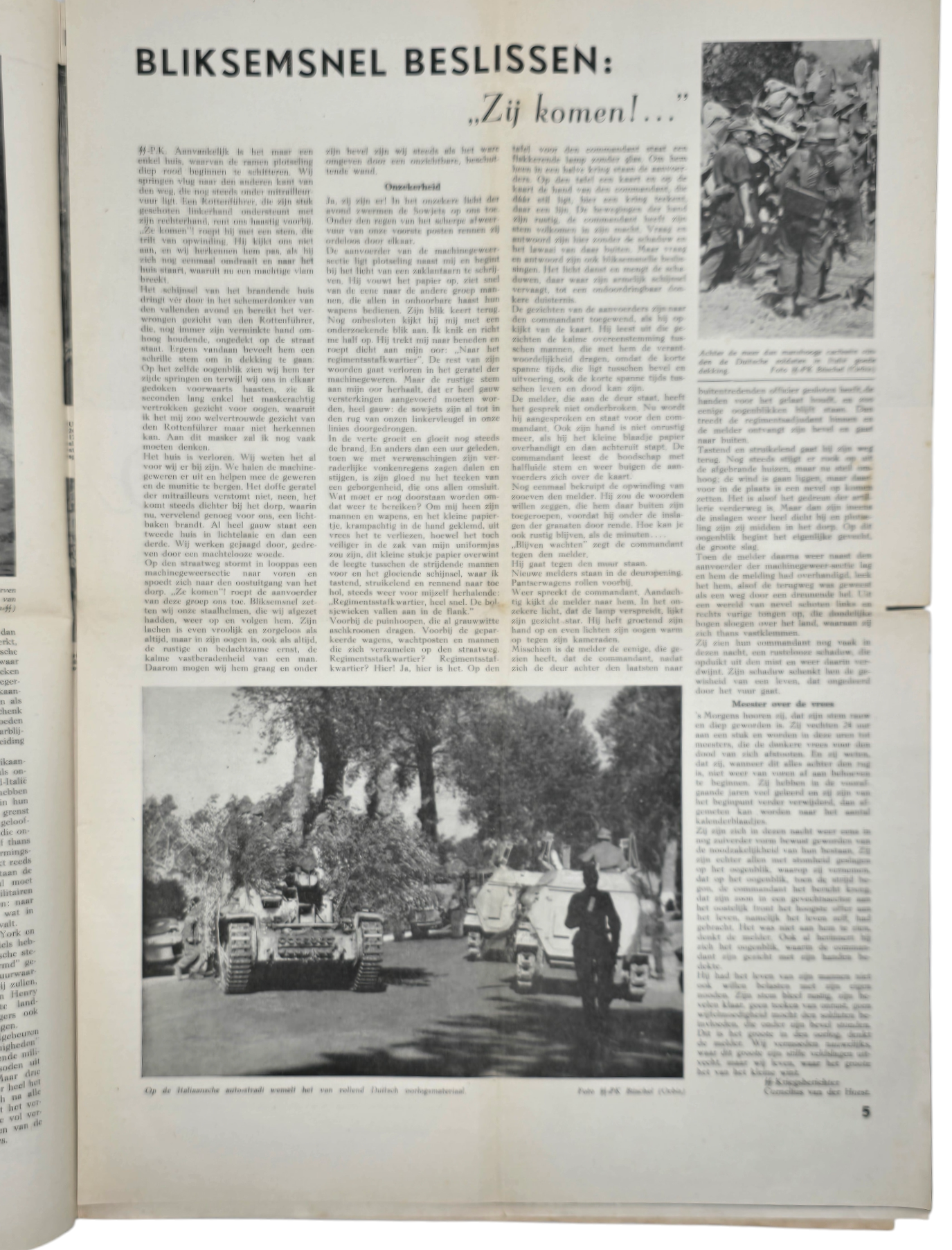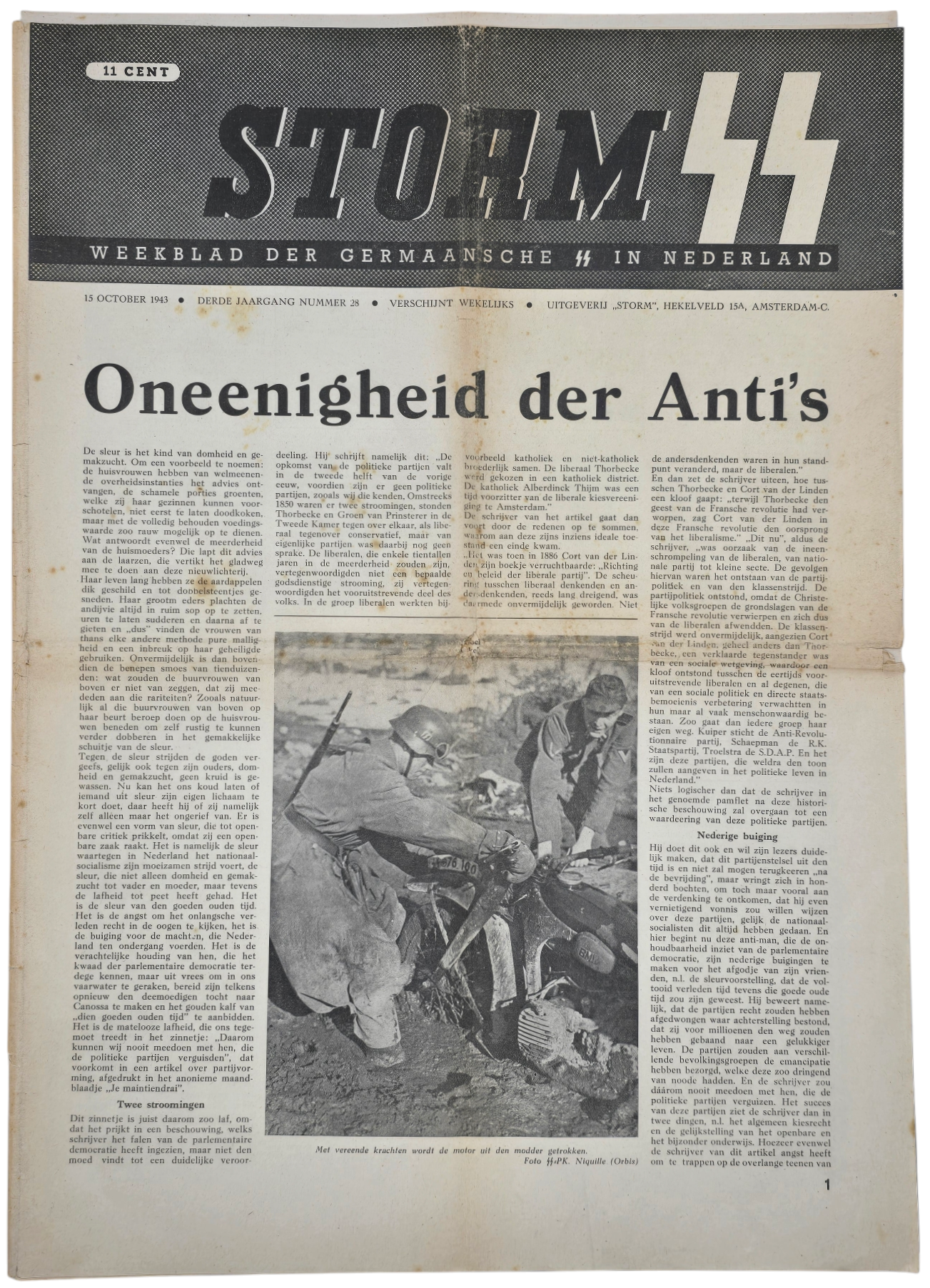 Storm SS was the newspaper for the Dutch Waffen SS sympathizers. The newspaper began in 1941 and ended in May 1945. The newspaper often shows (Dutch) Kriegsberichter photos, political articles, and caricatures. Damaged.