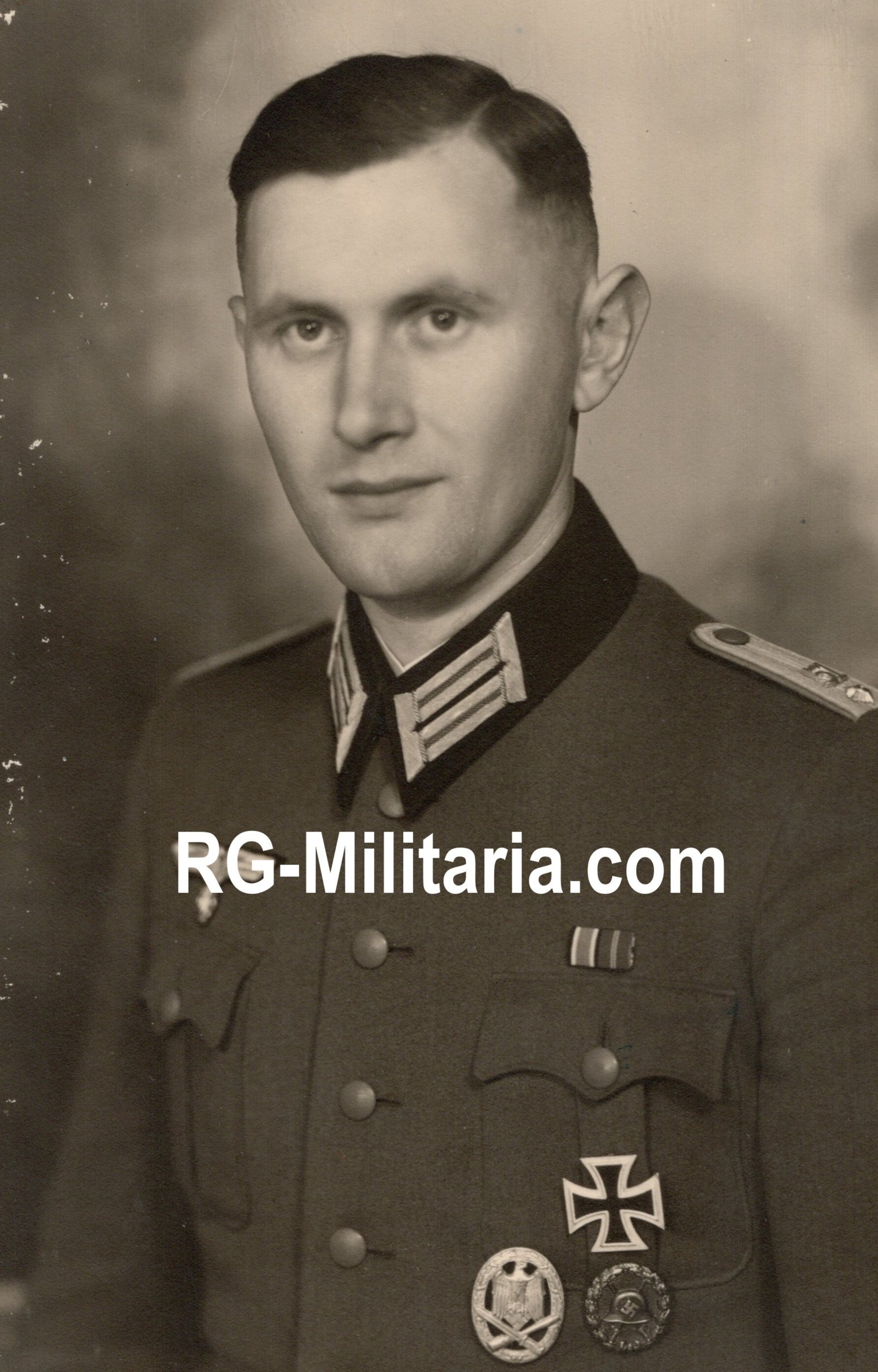 He is wearing a wound badge, EK1 and a Allgemeines Sturmabzeichen (General Assault Badge). On the spange, there are ek2 and Ostfront ribbons.