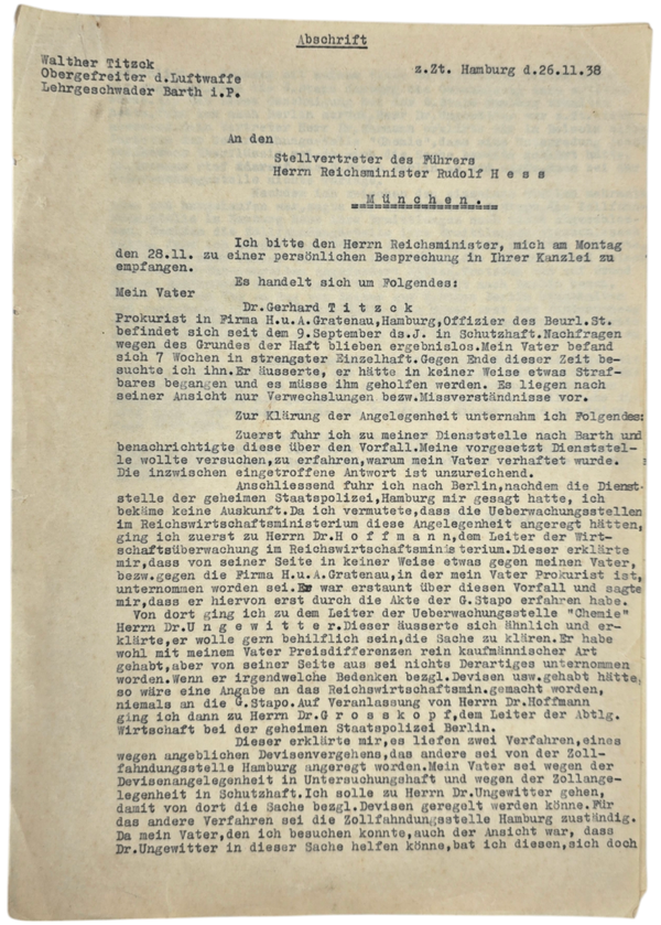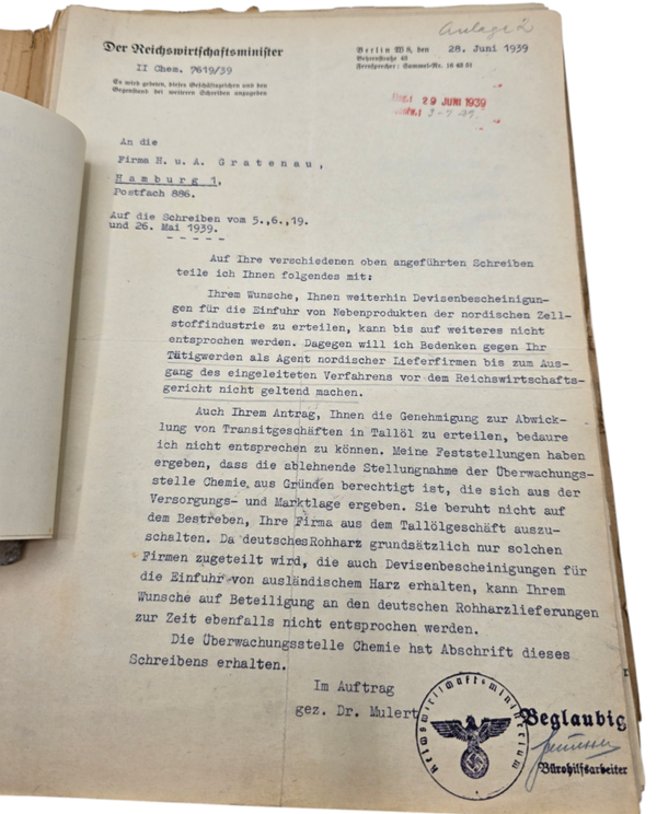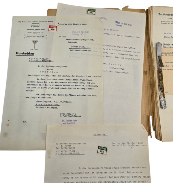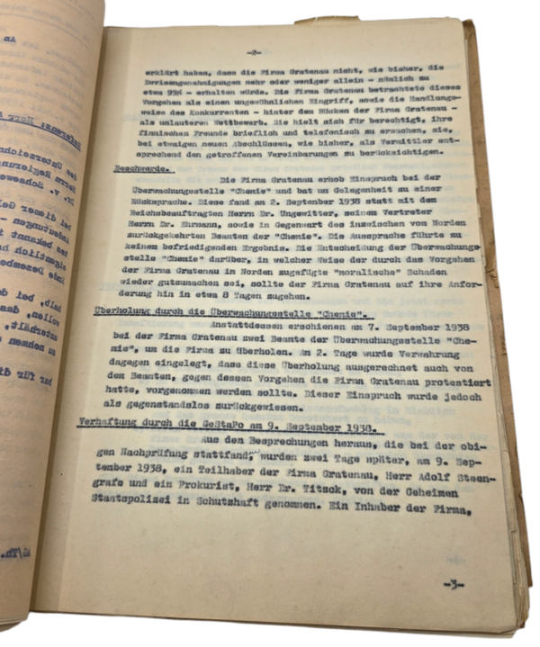 Originele Wo2 Duits Document - documenten set over de gevangenneming van de eigenaar van het bedrijf Gratenau Chemie, Hamburg (1939)