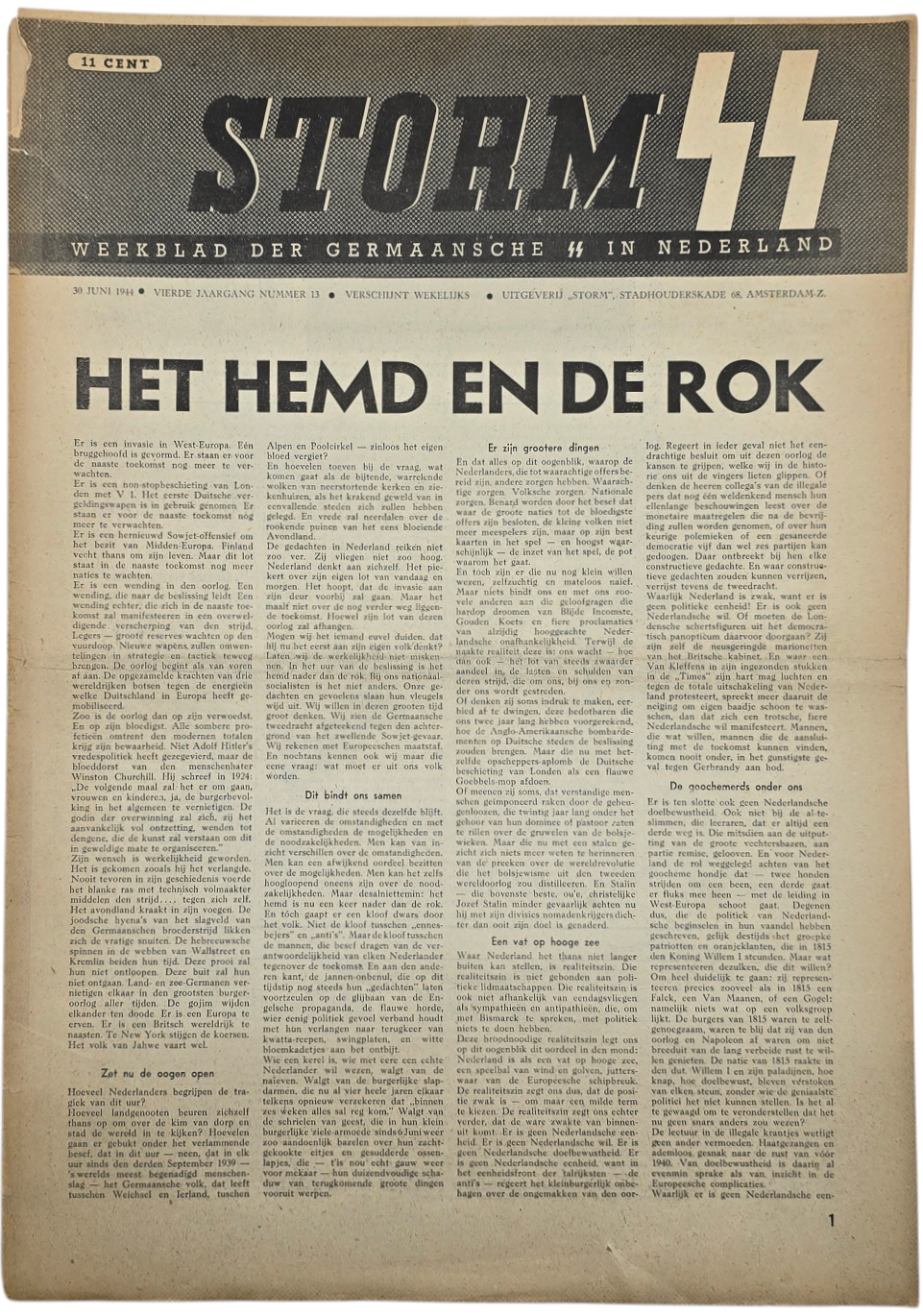 Storm SS was the newspaper for the Dutch Waffen SS sympathizers. The newspaper began in 1941 and ended in May 1945. The newspaper often shows (Dutch) Kriegsberichter photos, political articles, and caricatures.