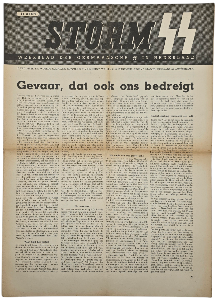 Storm SS was the newspaper for the Dutch Waffen SS sympathizers. The newspaper began in 1941 and ended in May 1945. The newspaper often shows (Dutch) Kriegsberichter photos, political articles, and caricatures.