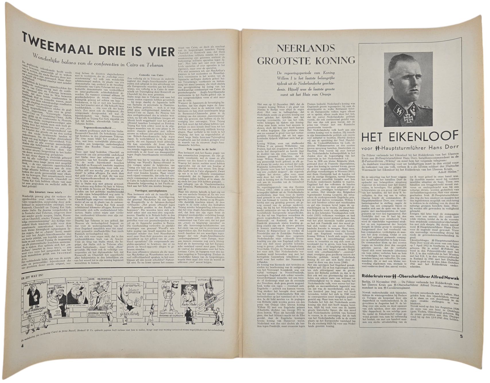 Storm SS was the newspaper for the Dutch Waffen SS sympathizers. The newspaper began in 1941 and ended in May 1945. The newspaper often shows (Dutch) Kriegsberichter photos, political articles, and caricatures.