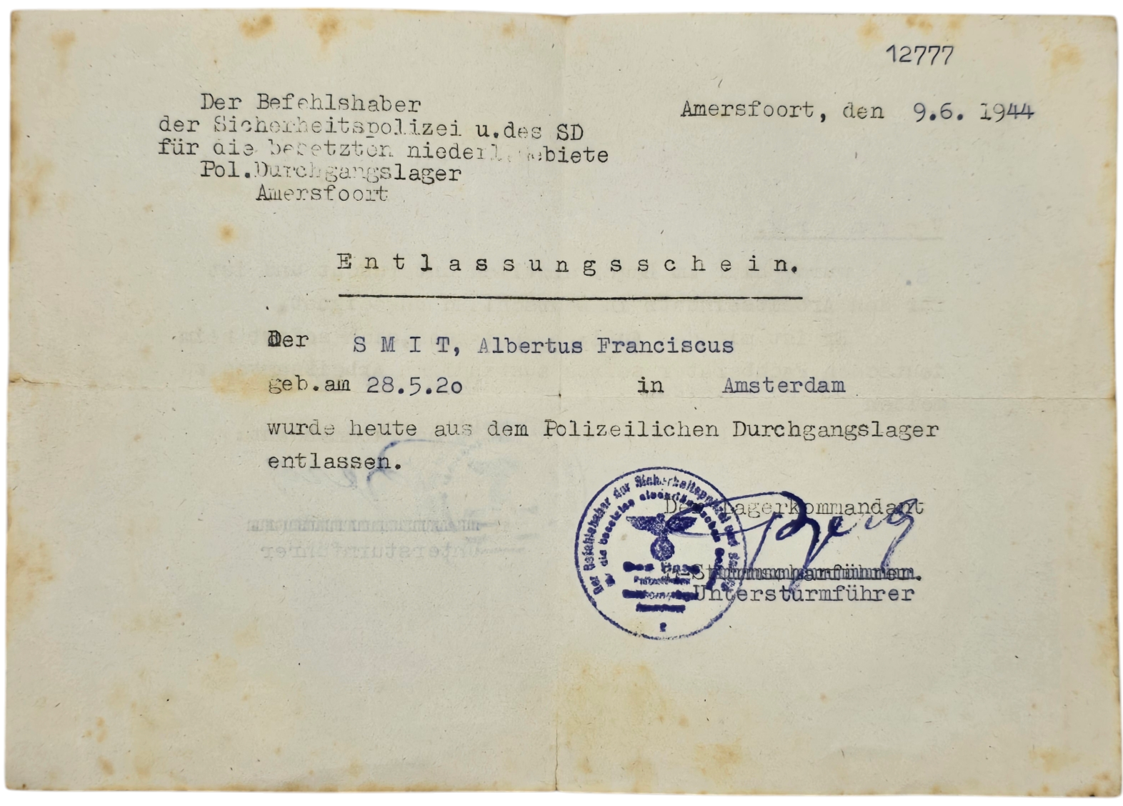 Een origineel vrijlatingsbewijs van het Politisches Durchgangslager Amersfoort, ook bekend als het concentratiekamp Amersfoort. Dit bewijs was voor Albertus Franciscus Smit, geboren op 28 mei 1920 in Amsterdam. Zijn kampnummer was 12777. De kamparts onderzocht hem op 25 mei en hij had een middenoorontsteking, zijn laatste bezoek was op 7 juni 1944. Twee dagen later, op 9 juni, werd hij vrijgelaten.