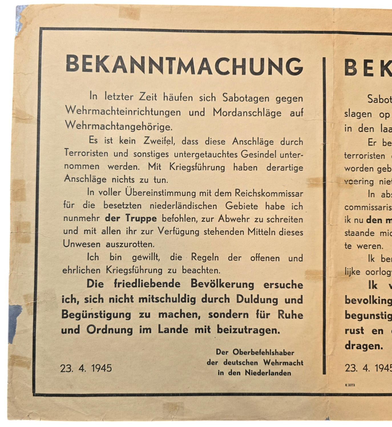 Printed in Rotterdam with K number 2072. By the WBN Wehrmachtbefehslhaber in den Niederlanden Friedrich Christiansen. Very late-war poster.