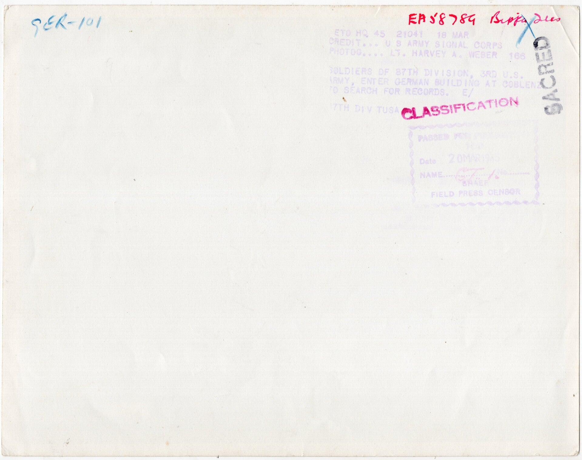 Originele Wo2 Amerikaanse Persfoto - Militairen van de 87ste Divisie betreden een Duits politiebureau in Koblenz (1945)