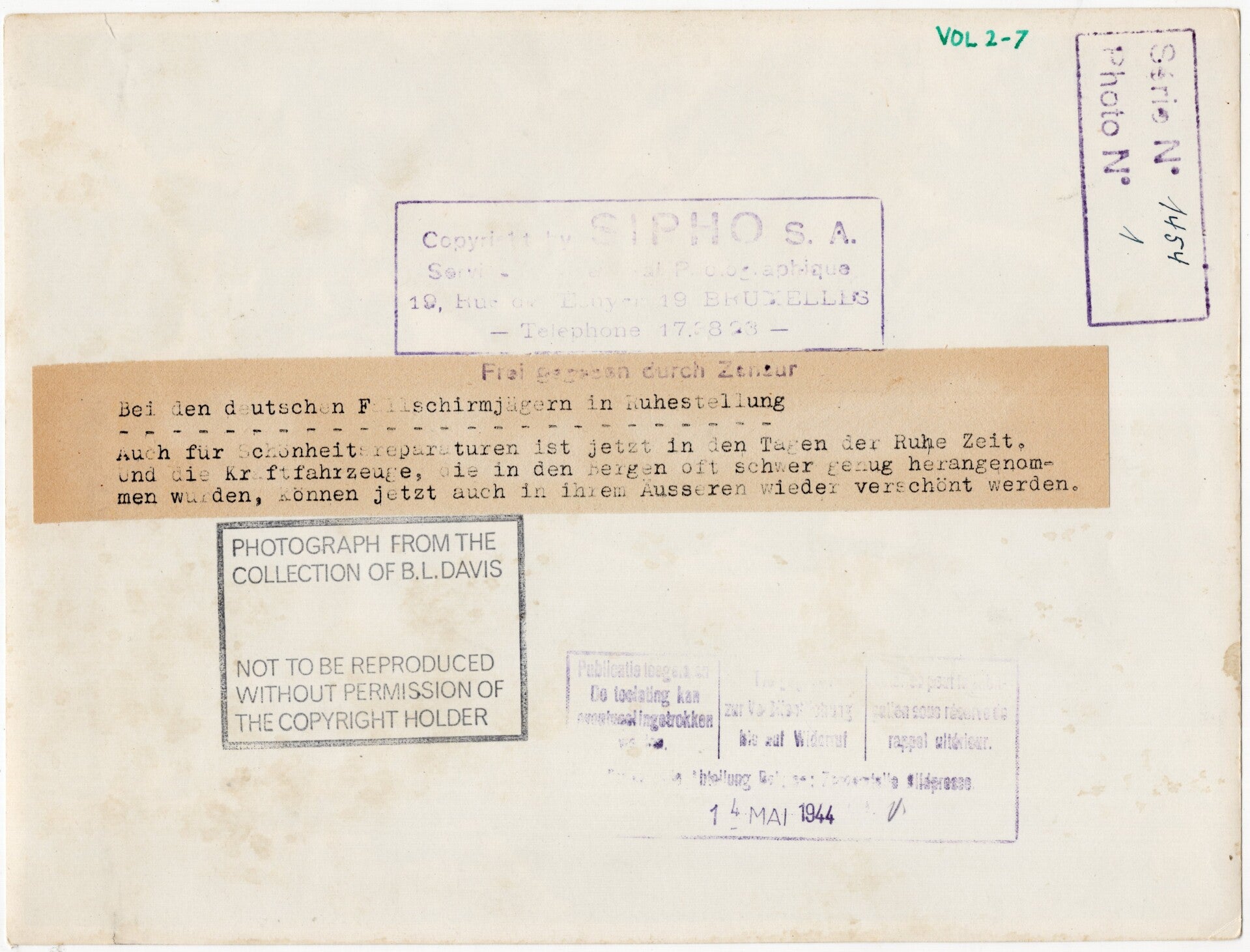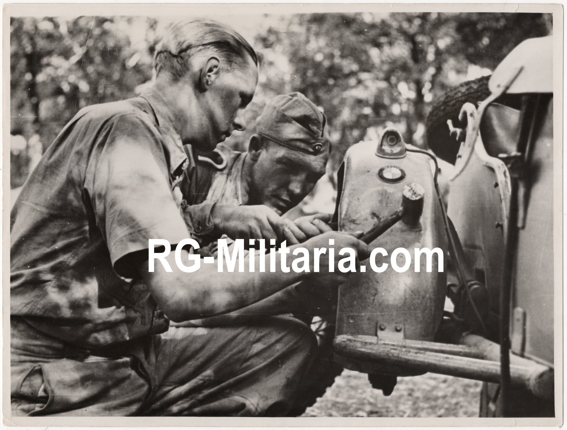 Originele Wo2 Duitse Persfoto - Duitse parashutisten repareren een BMW voertuig (1944)