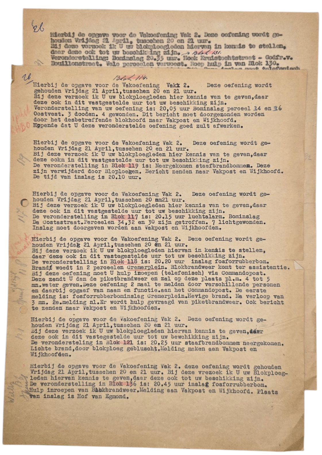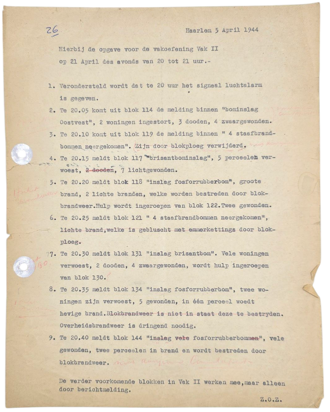 A large document group of LBD documents from Haarlem from 1941 to 1944. There are more than 30 individual documents in the set, and that does not include multiple pages ''per item''. Some of the documents have been perforated and reinforced to put into a binder. Many documents about air raid practices for the region with fake scenarios. It also includes an LBD Haarlem booklet from 1946 about the Luchtbeschermingsdienst of Haarlem during WW2. The spine of this booklet is loose.