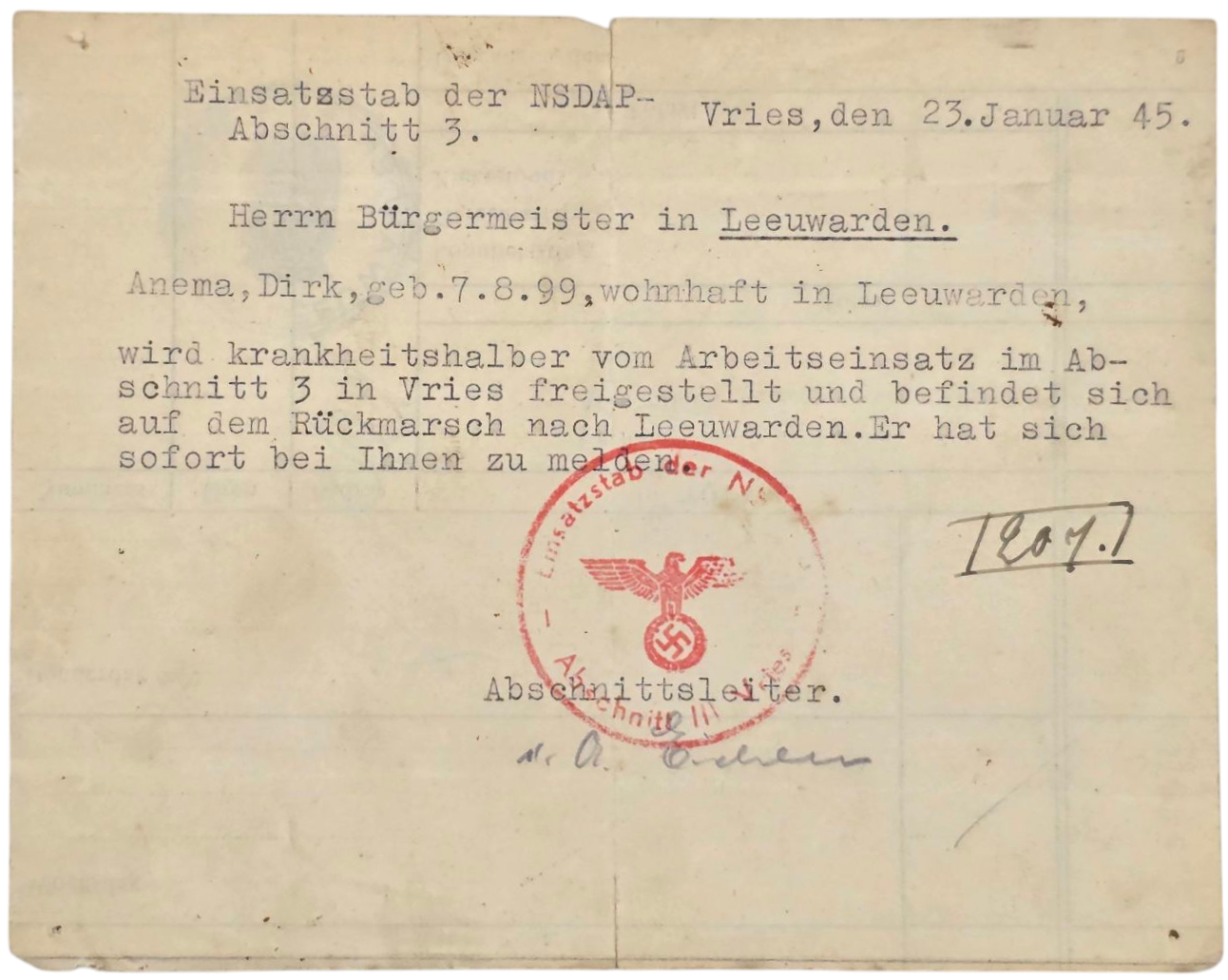 Original WW2 Dutch Document - Einsatzstab der NSDAP Abschnitt 3 OT Organisation Todt sick leave card, Vries, Leeuwarden (1945)