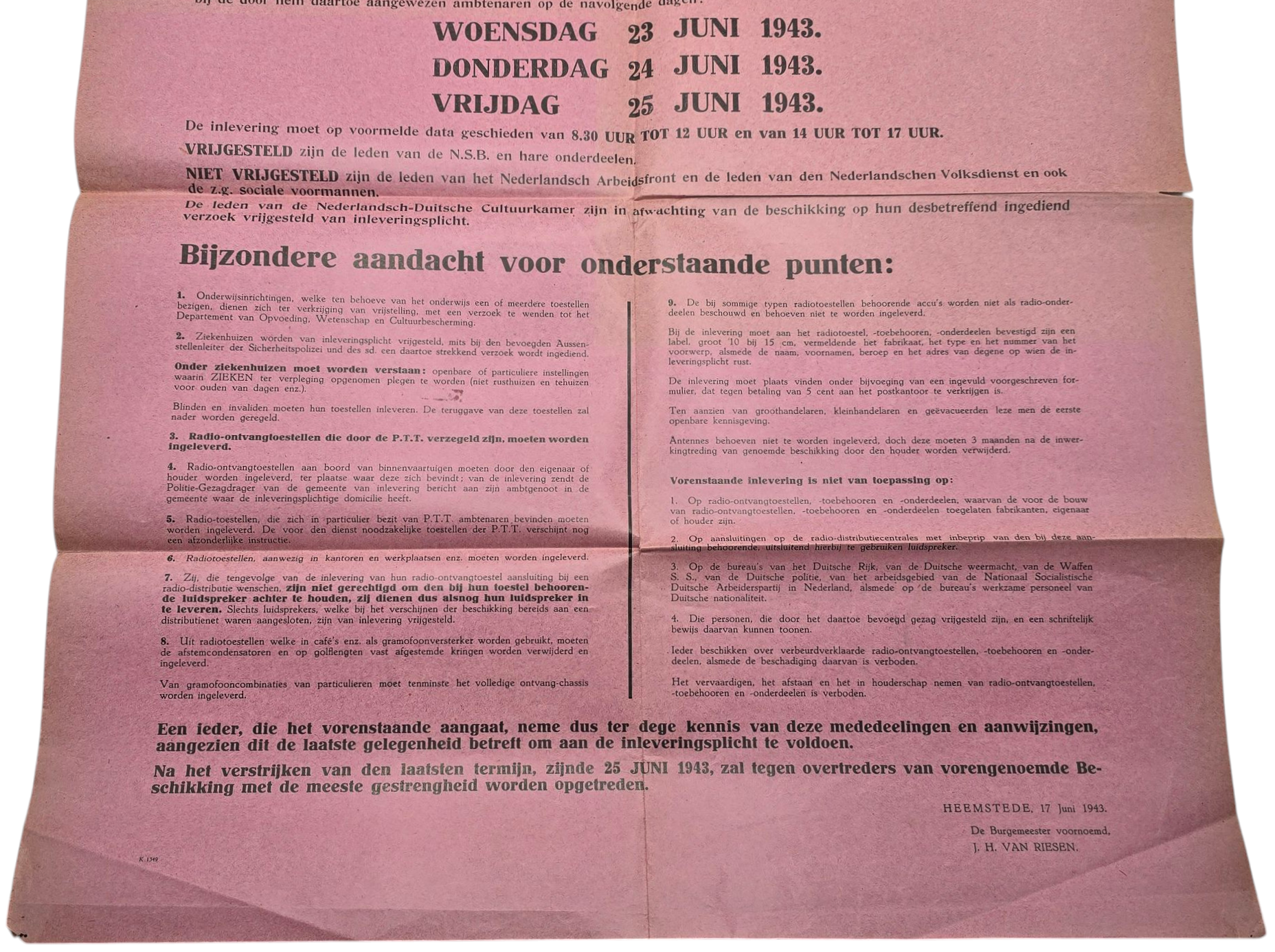 Originele Wo2 Nederlandse Poster - Oproep openbare bekendmaking betreffende het navorderen van Radio ontvangtoestellen, Heemstede, Juni (1943)