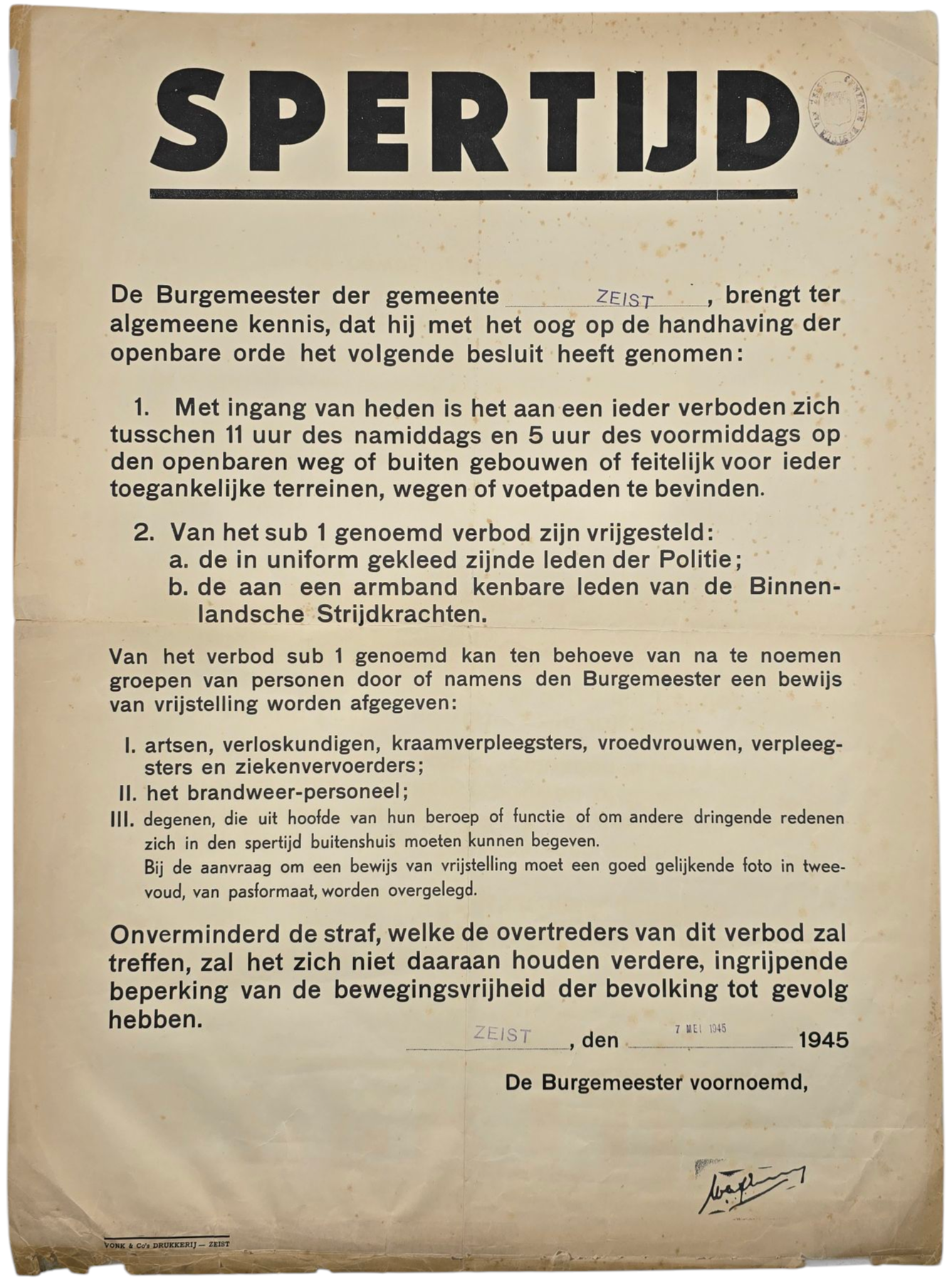 Original WW2 Dutch Liberation Poster - Announcement Curfew ''Spertijd'', Zeist, 7th of May (1945)