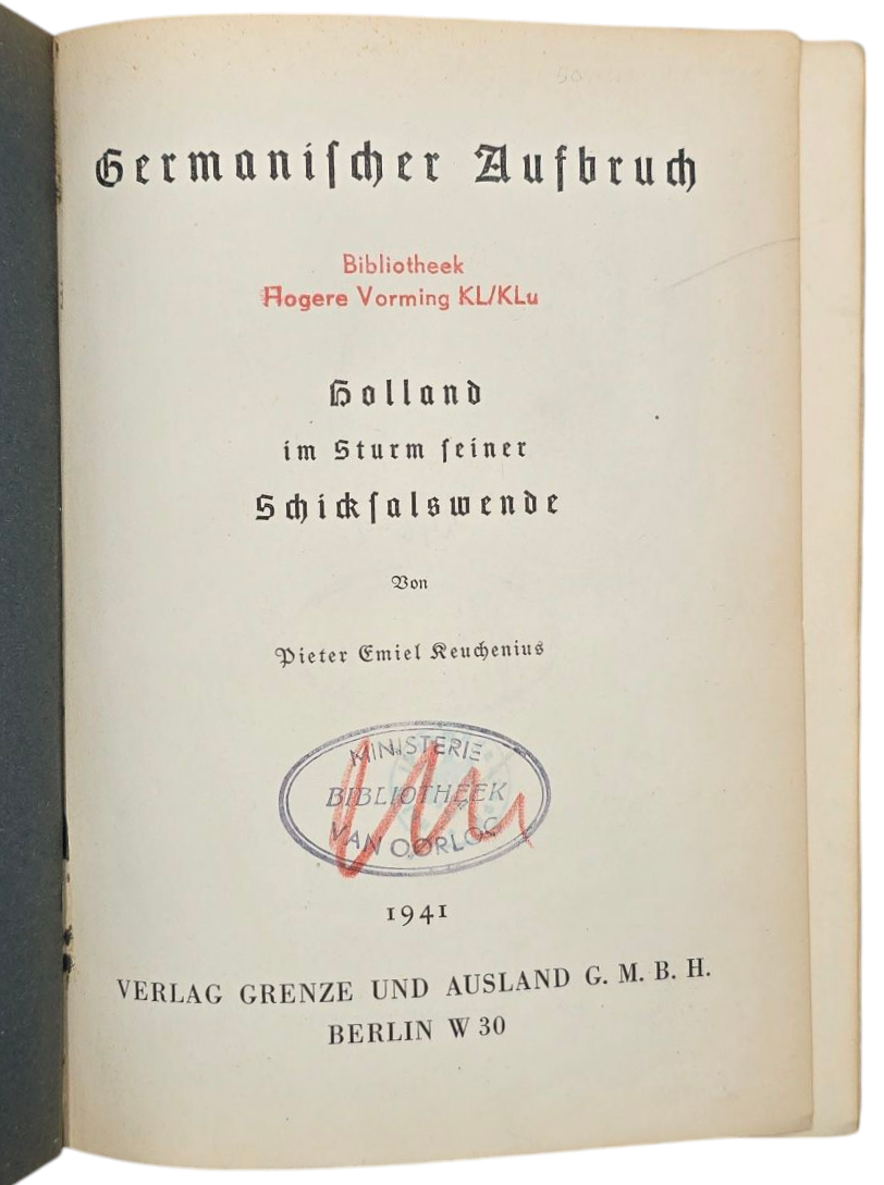 The brochure has been turned into a hardcover, with many ex libris stamps. See pictures. Pieter Emiel Keuchenius was a Dutch NSB writer mostly known for his book ''Bloed en mythe als levenswet''