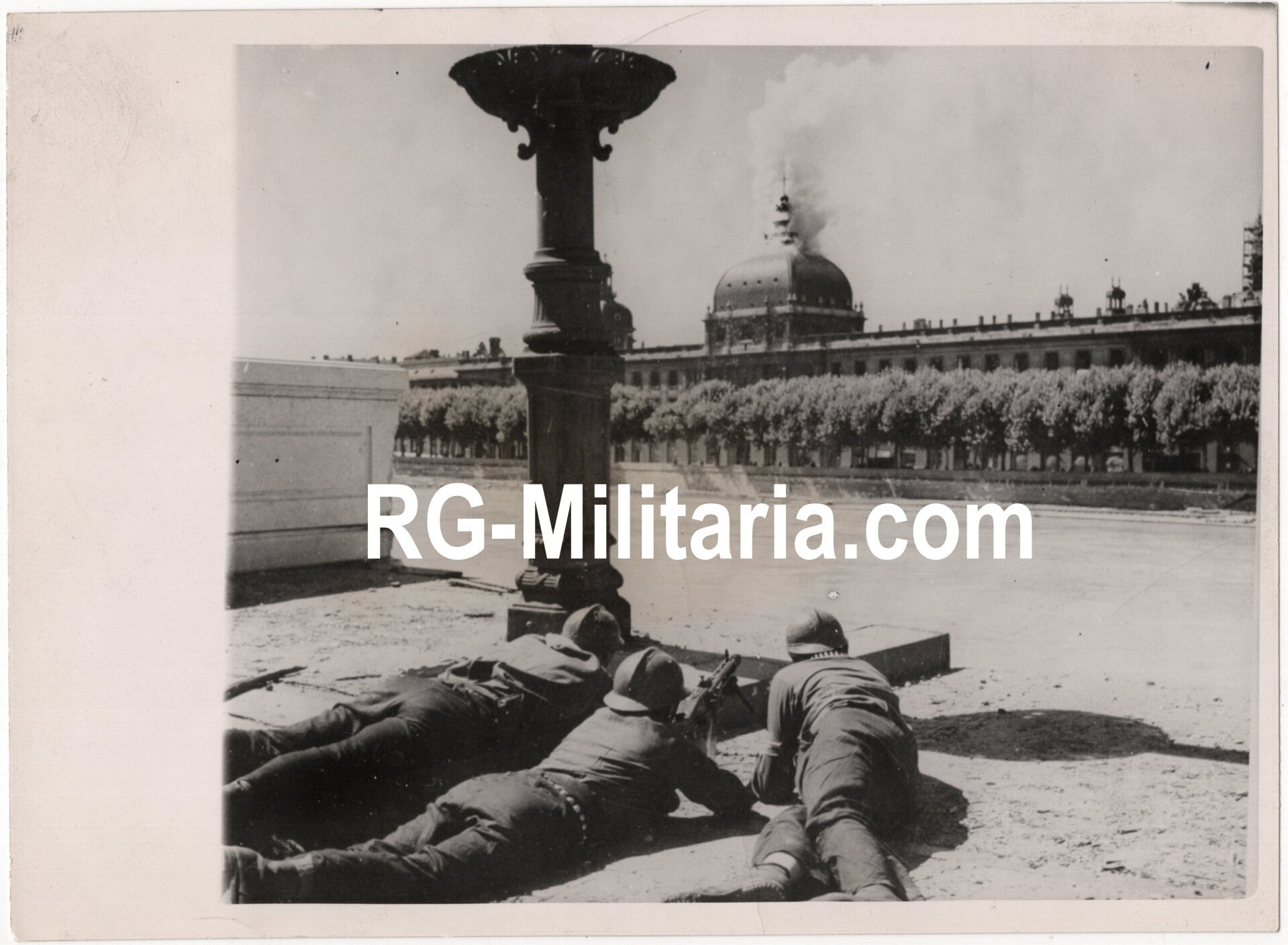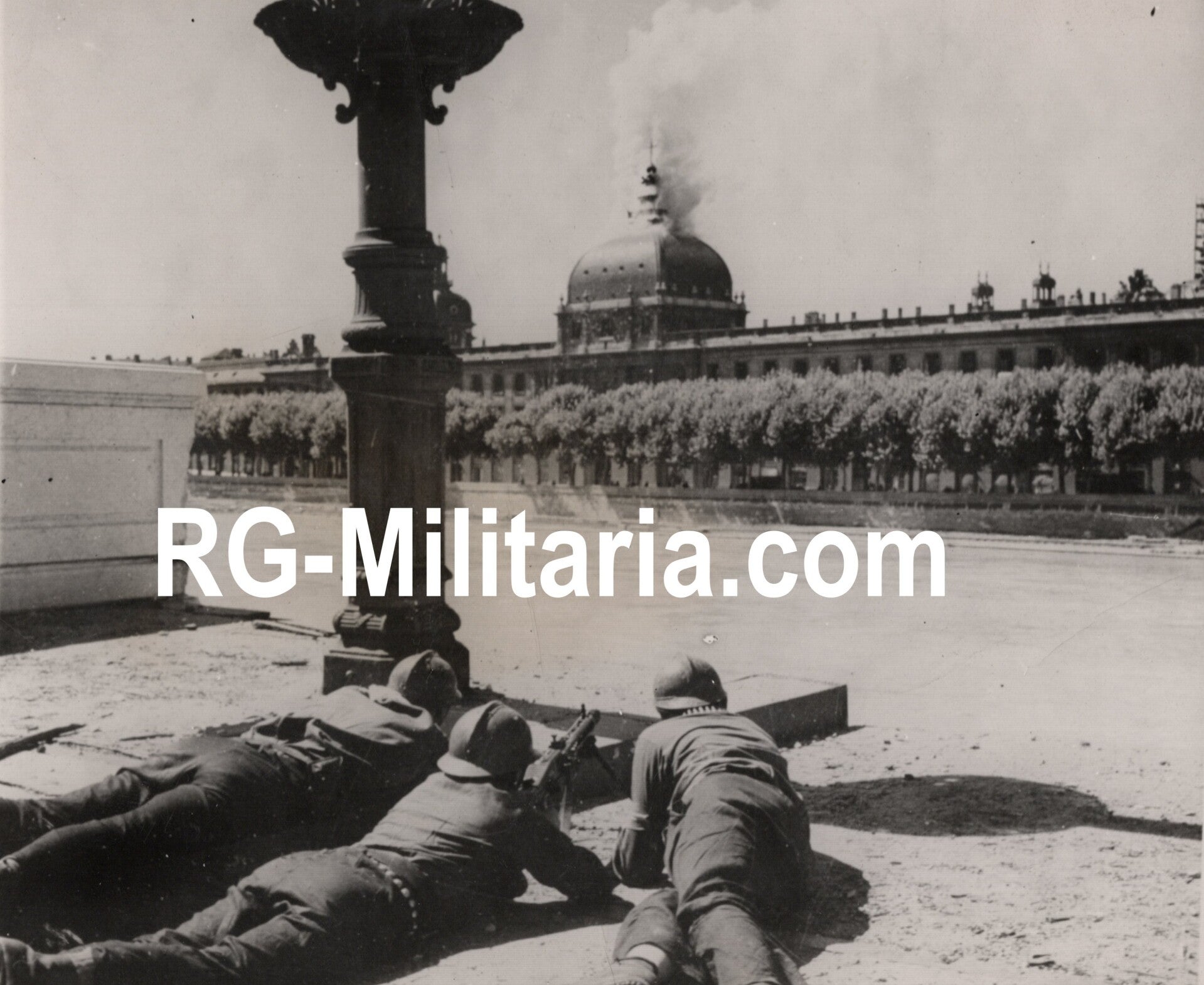 Original WW2 British Press Photo - French resistance by the burning Hotel Dieu Hospital Lyon, France (1944)