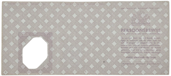 Ongebruikte Nederlandse identiteitskaart ''het Persoonsbewijs'' voor Nederlandse burgers. Het verzet gebruikte ongebruikte persoonsbewijzen zoals deze om andere te vervalsen voor mensen die een nieuwe identiteit nodig hadden (verzetsstrijders of Joodse mensen).