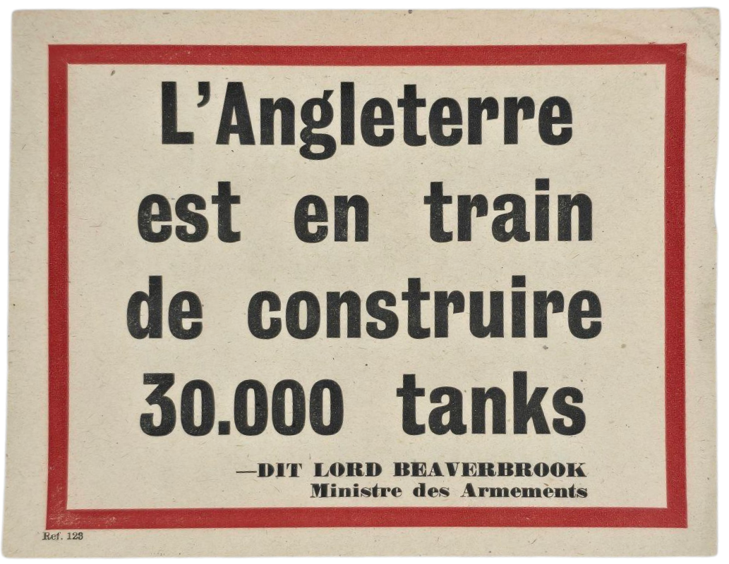 Original WW2 British Leaflet - L'Angleterre est en train de construire 30.000 tanks, Dit Lord Beaverbrook