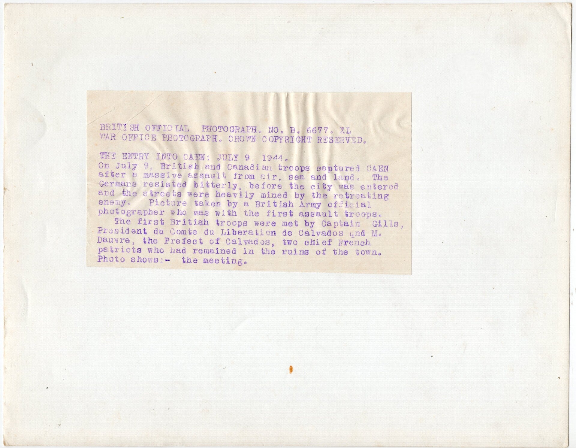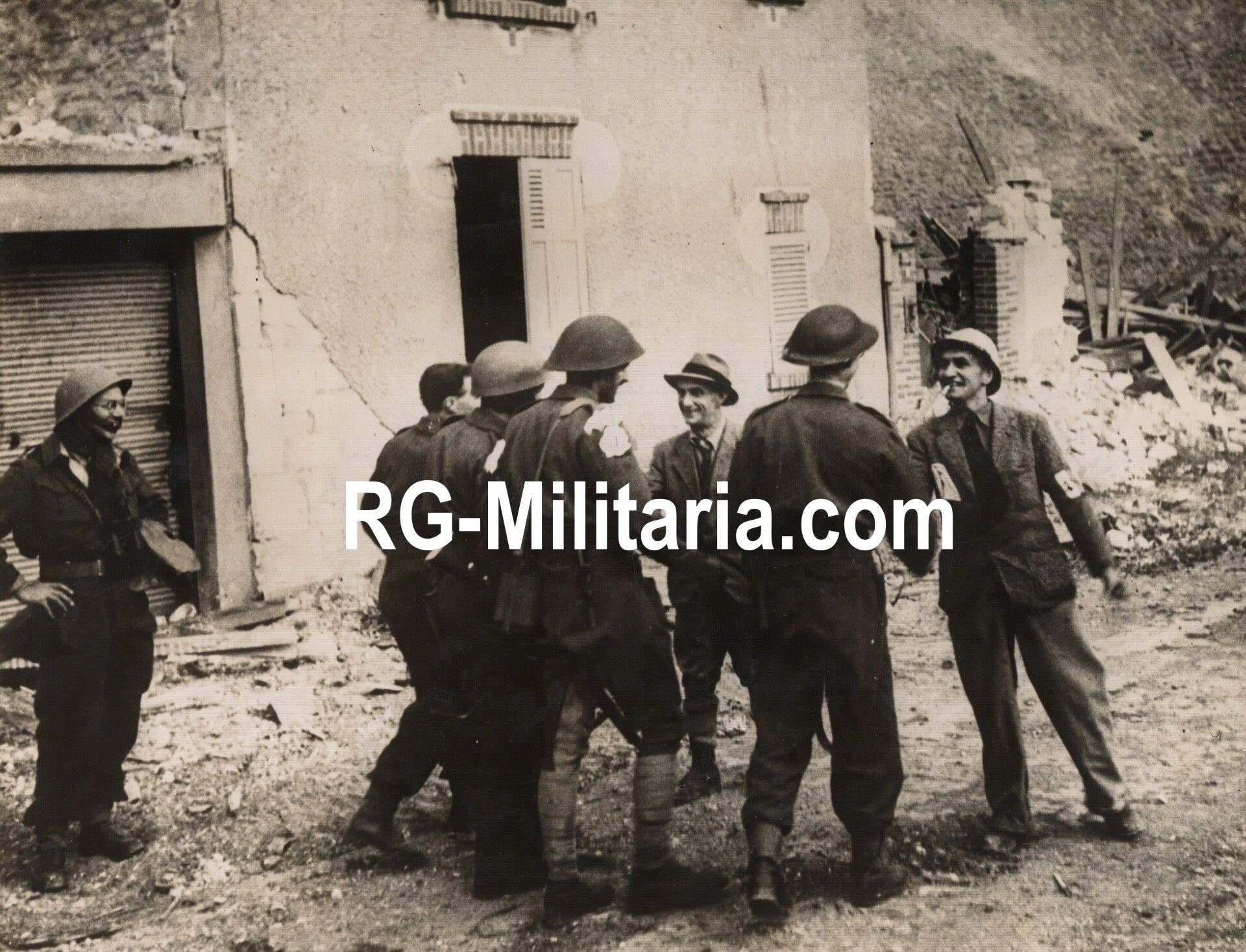 Originele Wo2 Britise Persfoto - Britse en Canadese troepen ontmoeten Frans lokaal verzet Caen, Normandy, France (1944)