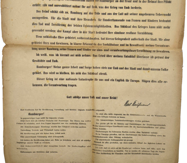 Rare poster edition of the Hamburger Zeitung with a message of the Gauleiter of Hamburg, Karl Kaufmann.