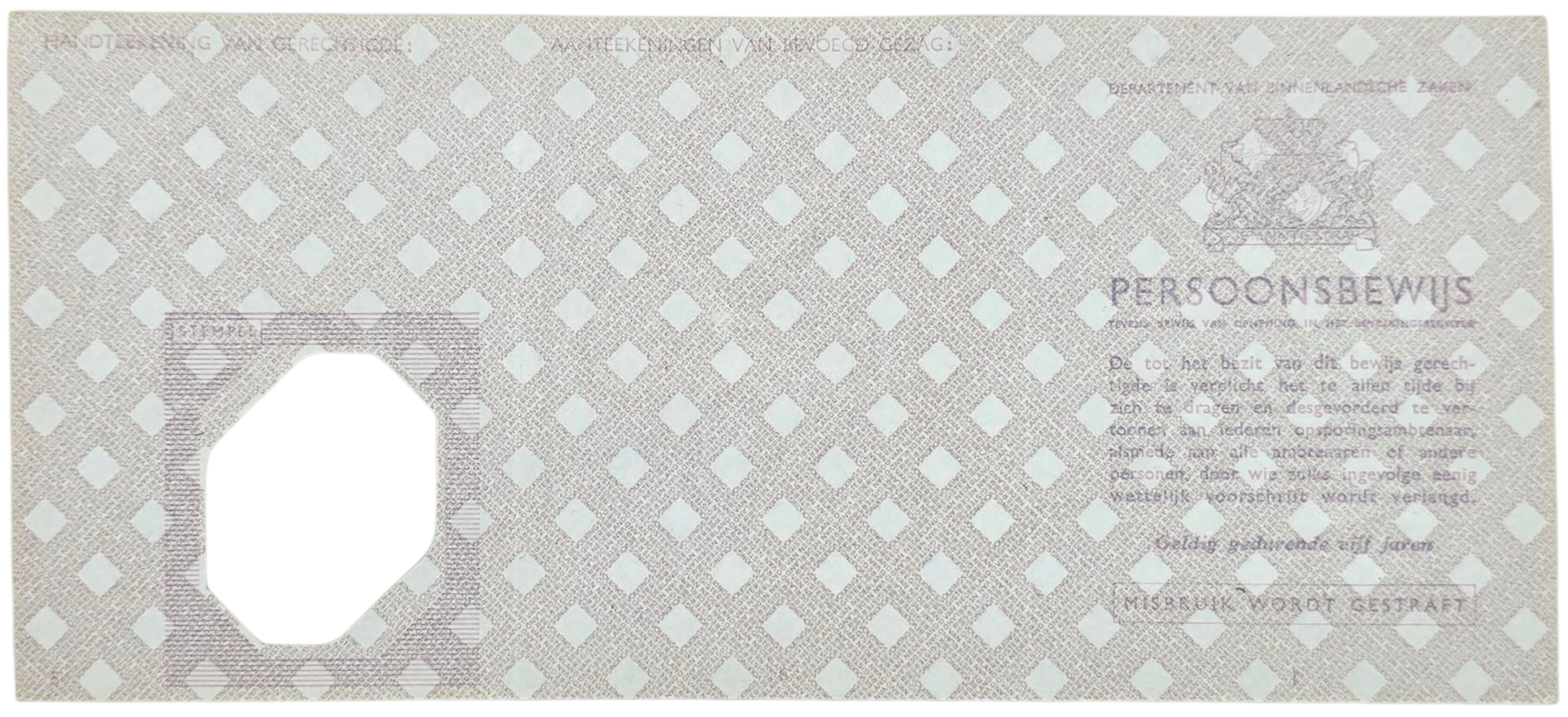 Unused Dutch ID card ''het Persoonsbewijs'' for Dutch civilians. The resistance used unused persoonsbewijzen like these to forge others for people who needed a new identity (resistance workers or Jewish people).
