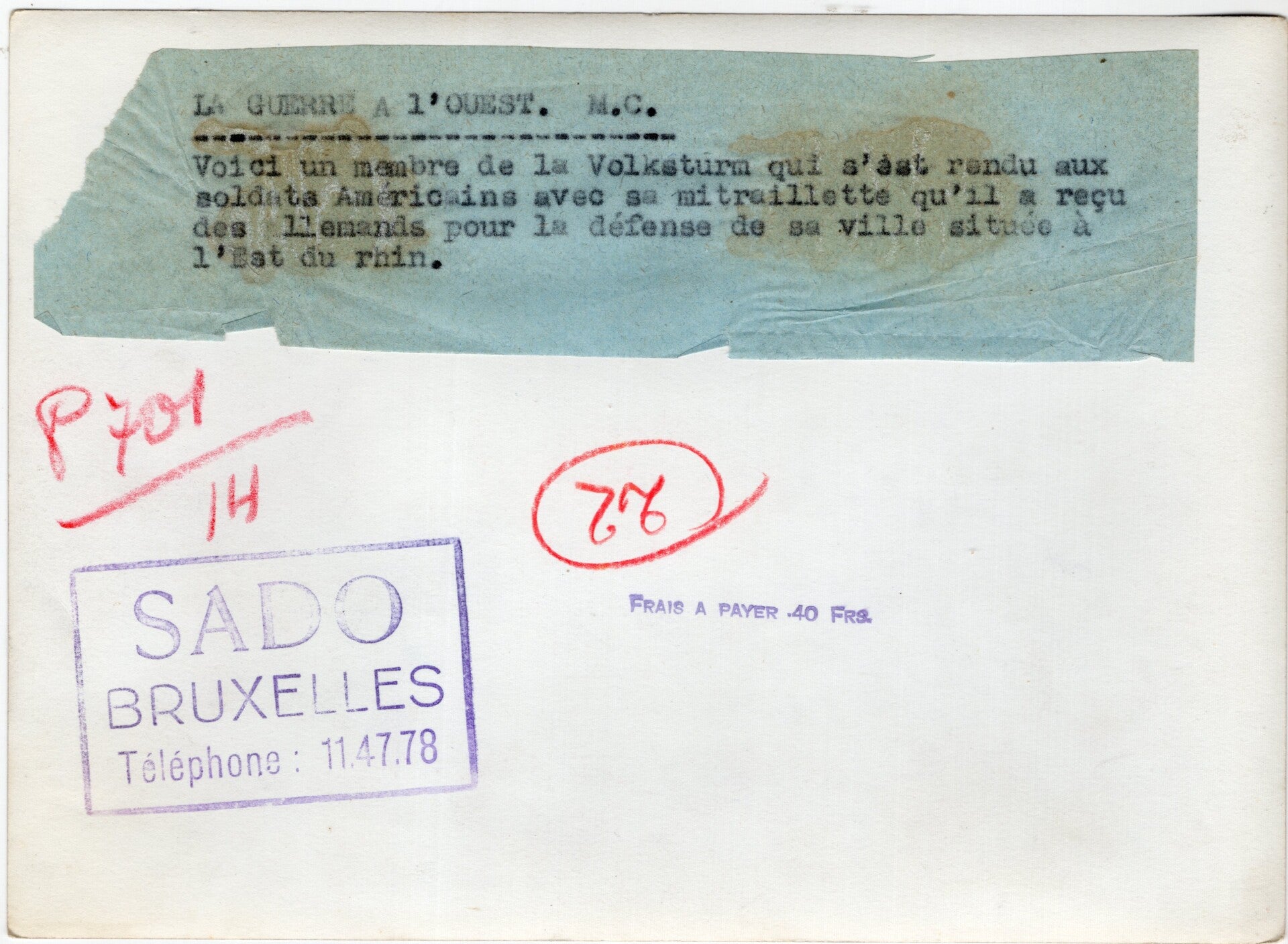 Originele Wo2 Franse Persfoto - Volkssturm lid met MP44 wordt door een Amerikaanse militair gevangengenomen, Rijn (1945)