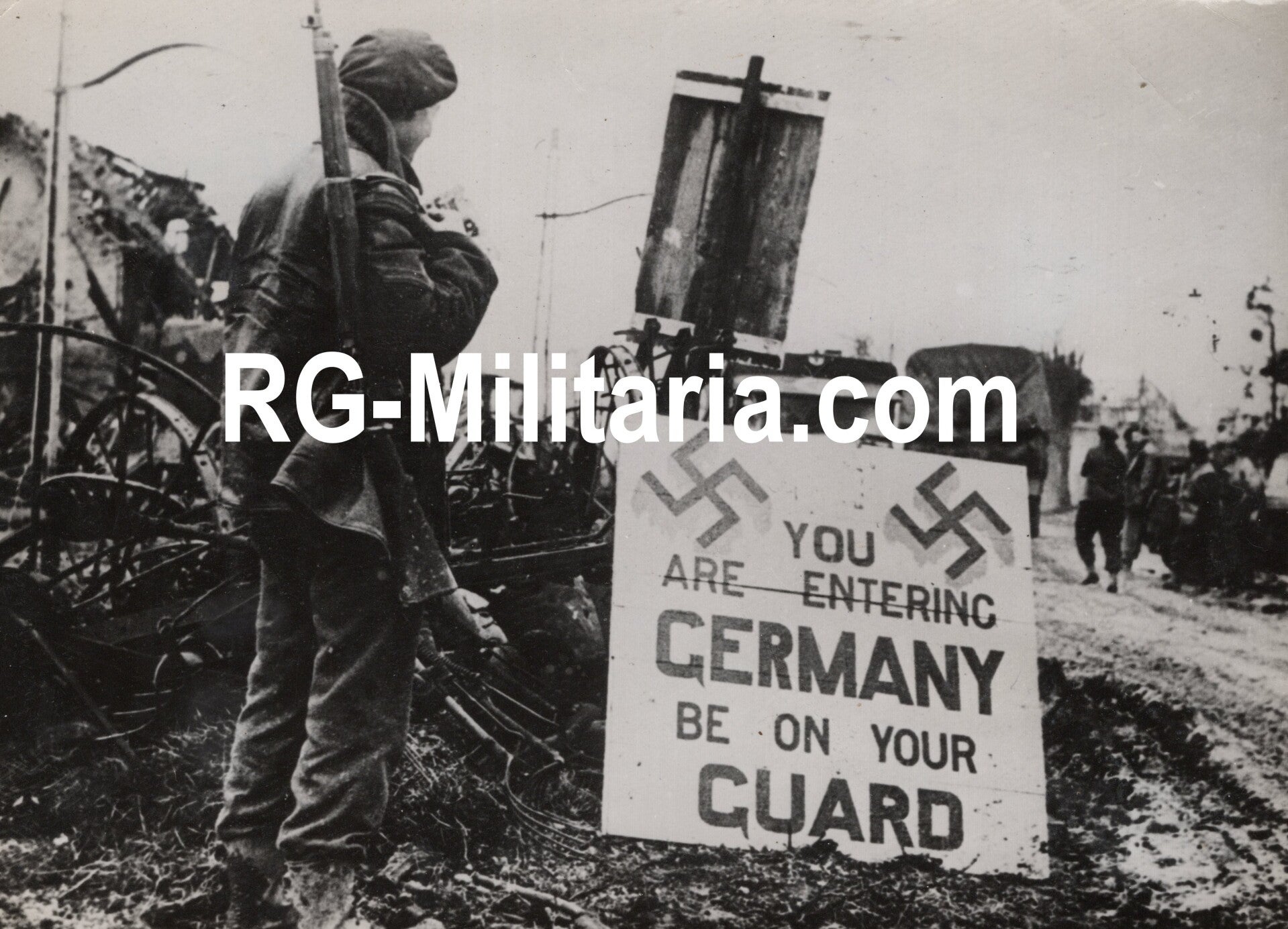 Original WW2 French Press Photo - British soldier at the German border ''You are entering Germany, be on your guard (1945)