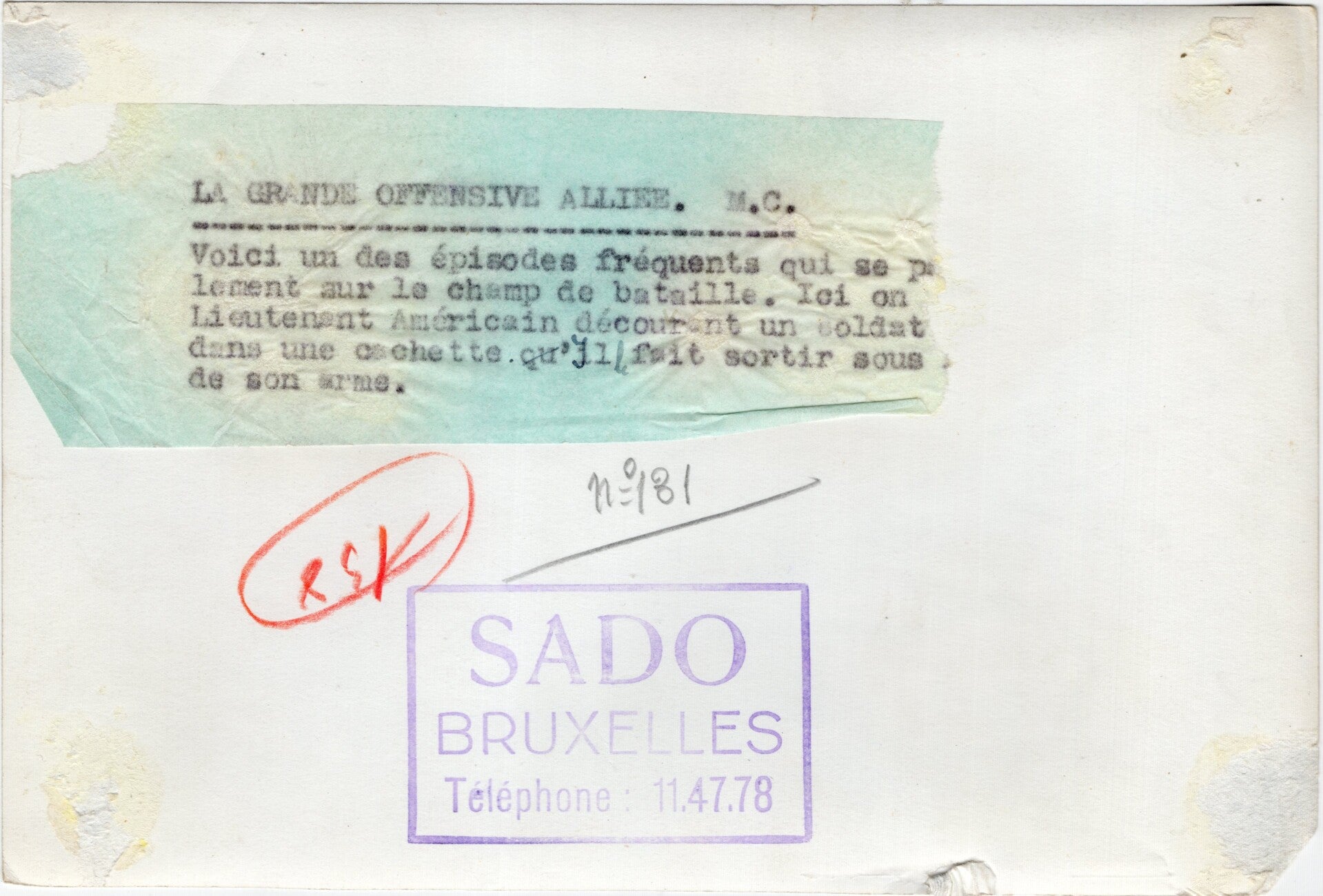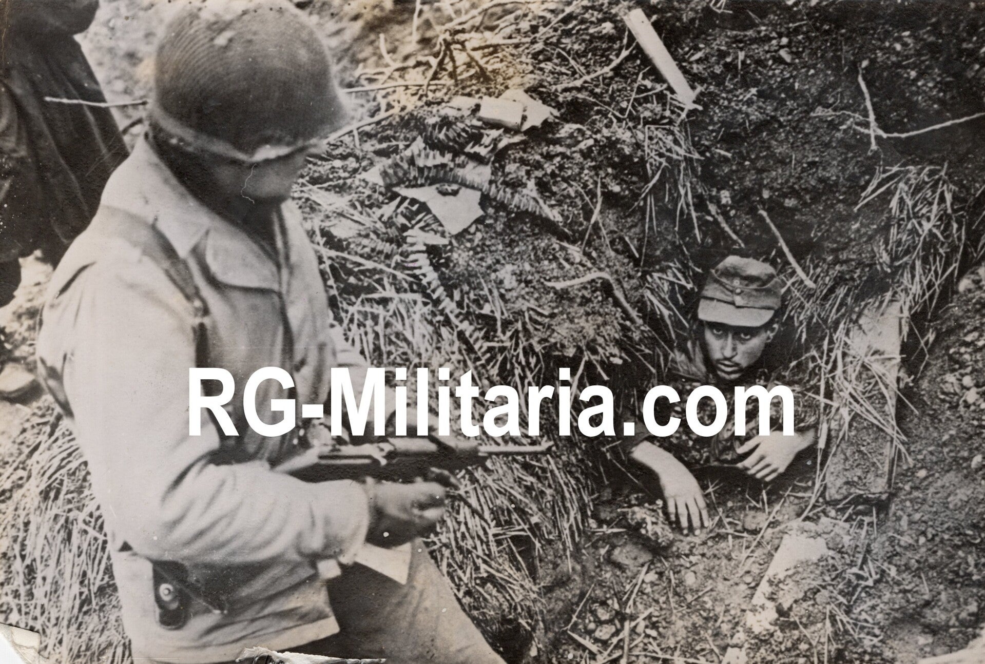 Originele Wo2 Franse Persfoto - Amerikaanse militair neemt een Duitse militair gevangen die vast zit in een loopgraf (1945)