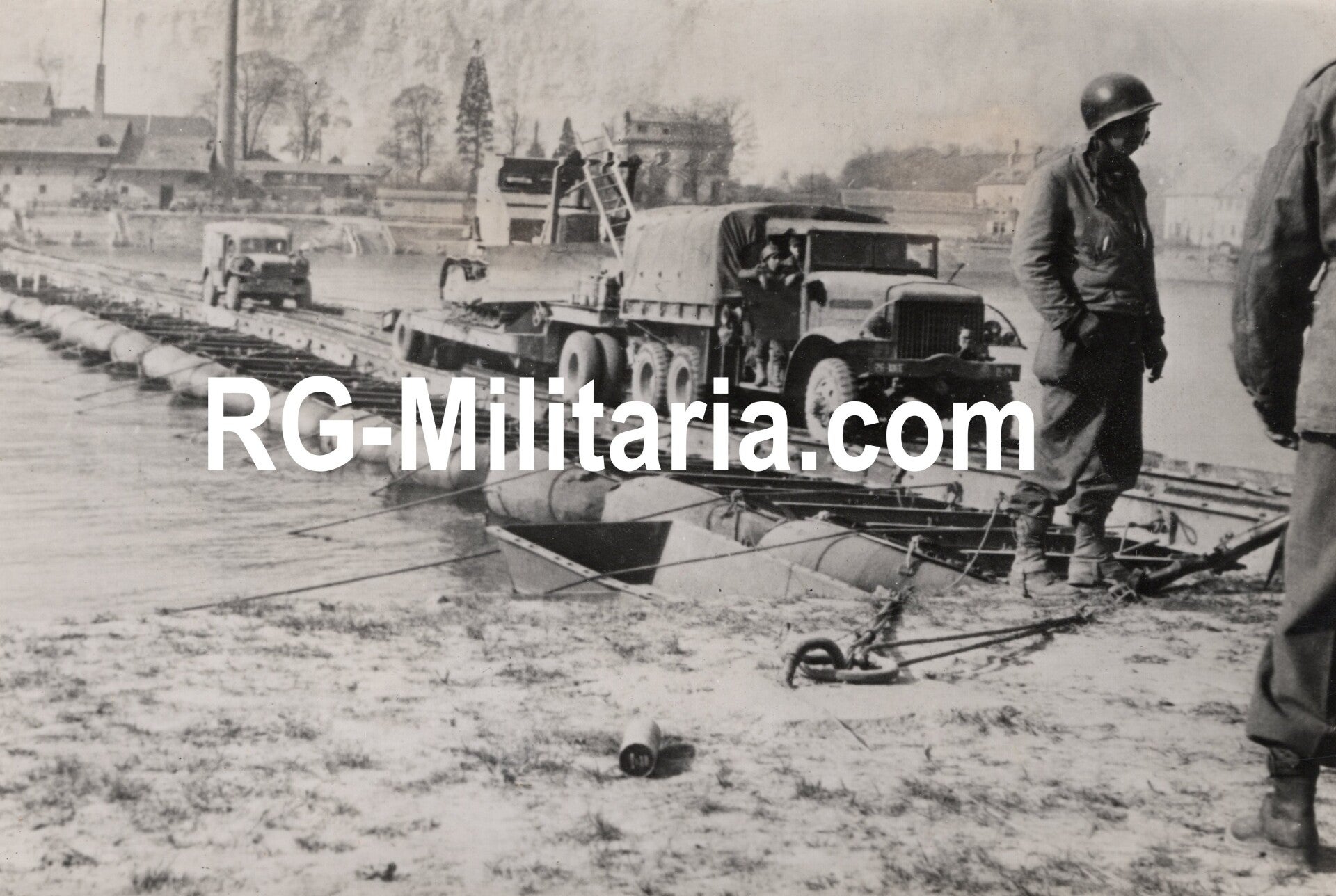 Originele Wo2 Franse Persfoto - Amerikaanse militairen rijden over een zelf gemaakte brug (1945)