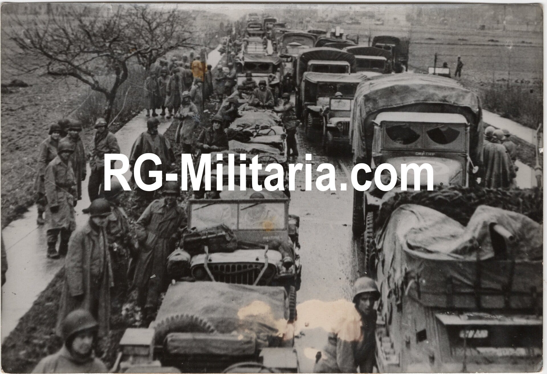 Originele Wo2 Franse Persfoto - Amerikaanse convooien zitten vast op Duitse wegen (1945)