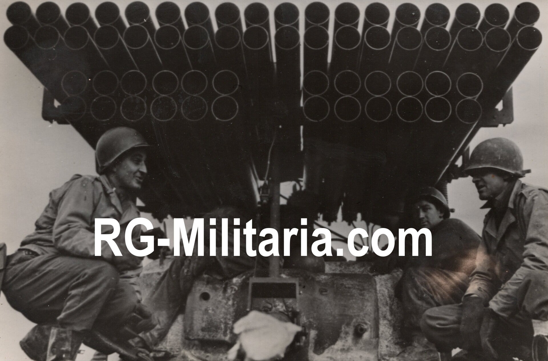 Originele Wo2 Franse Persfoto - Amerikaanse raketwerpers op een Sherman tank (1945)