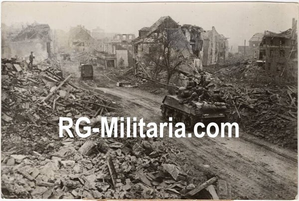 Originele Wo2 Franse Persfoto - Amerikaanse militairen op Sherman tanks rijden door een vernietigde stad