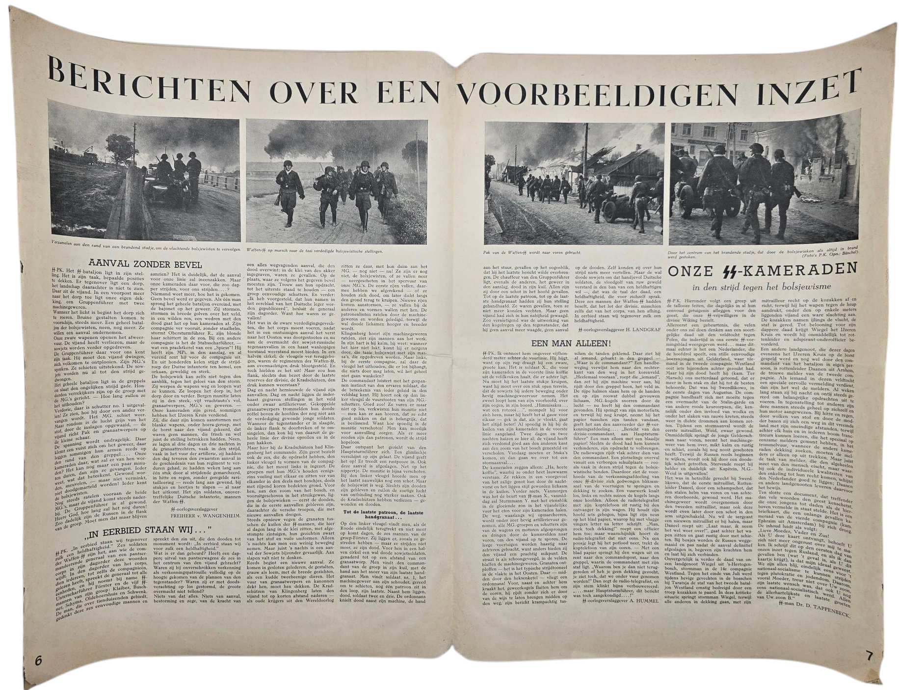 Storm SS was the newspaper for the Dutch Waffen SS sympathizers. The newspaper began in 1941 and ended in May 1945. The newspaper often shows (Dutch) Kriegsberichter photos, political articles, and caricatures. Very early edition of the SS newspaper.